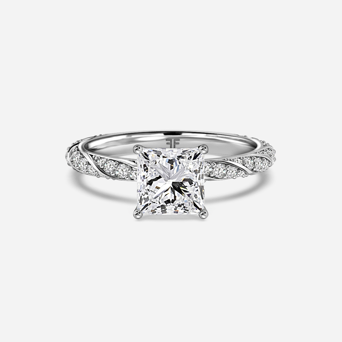 A platinum row of pavé diamonds twist around the band that flow up into a nature inspired petal designed collet. Handcrafted in Hatton Garden, London Centre Diamond Not Included Setting Only