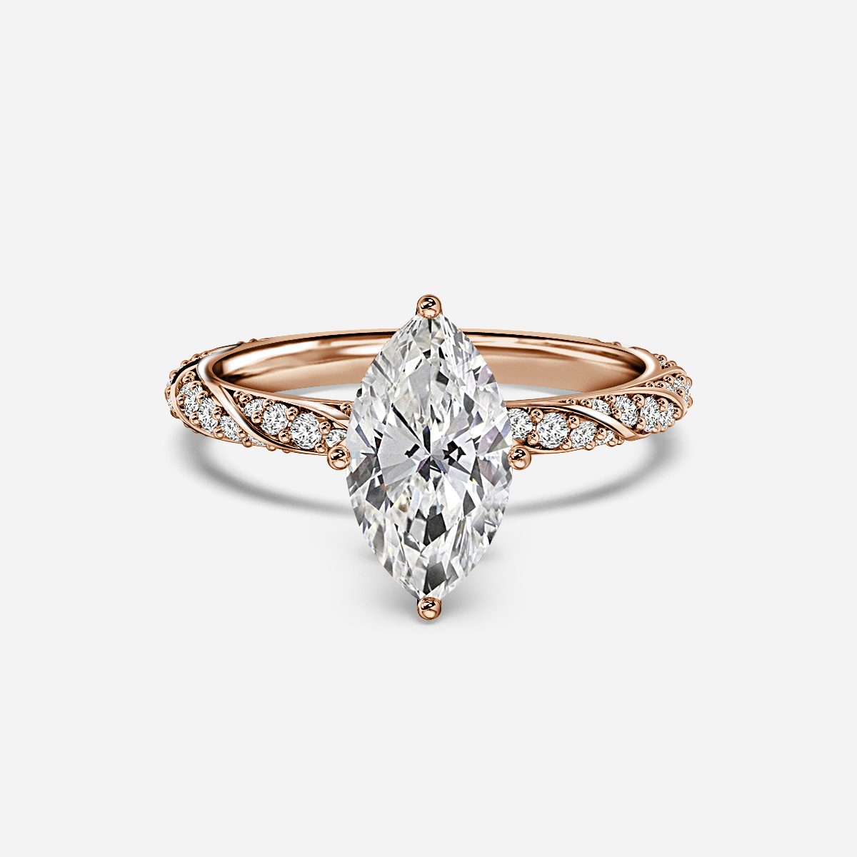 A rose gold row of pavé diamonds twist around the band that flow up into a nature inspired petal designed collet. Handcrafted in Hatton Garden, London Centre Diamond Not Included Setting Only