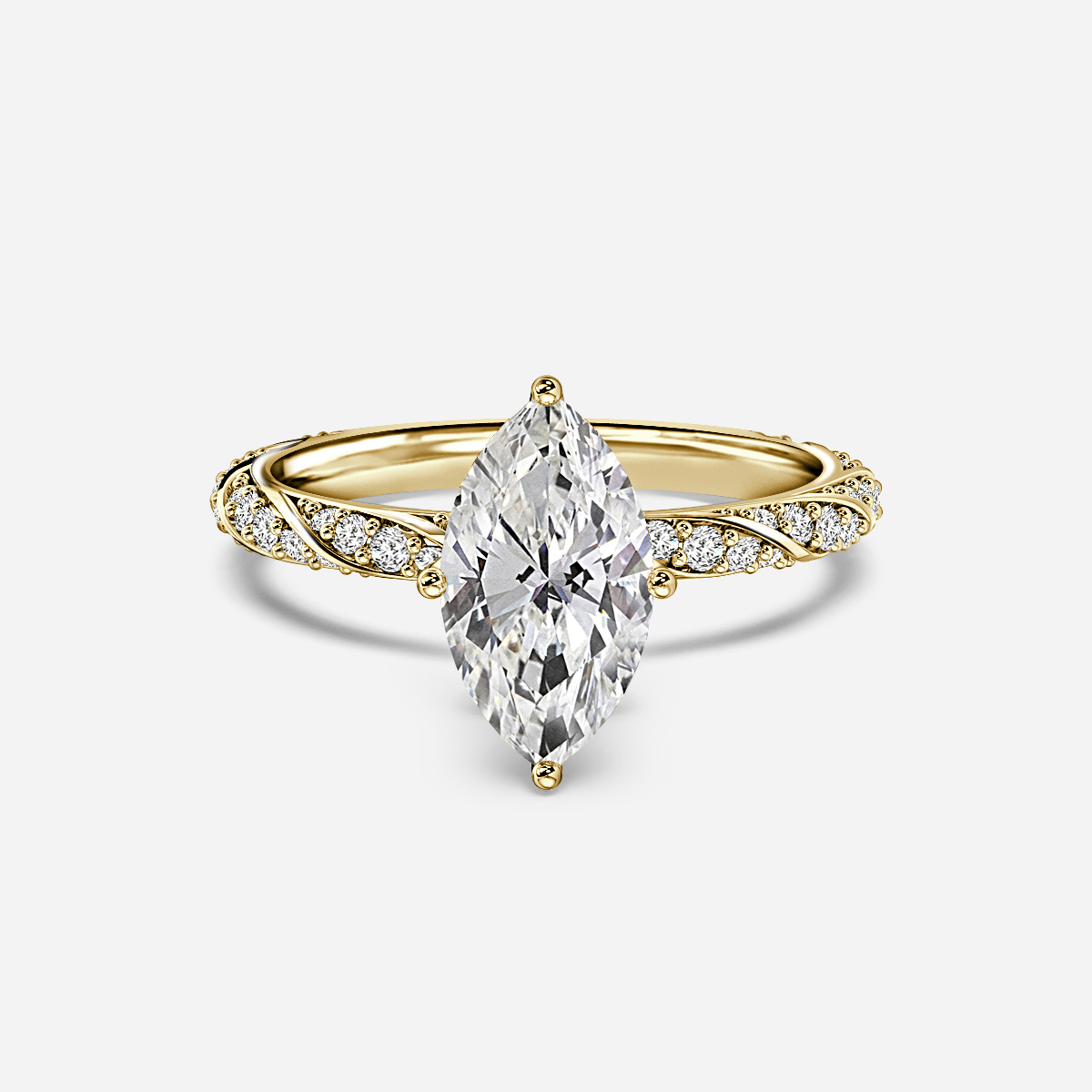A yellow gold row of pavé diamonds twist around the band that flow up into a nature inspired petal designed collet. Handcrafted in Hatton Garden, London Centre Diamond Not Included Setting Only