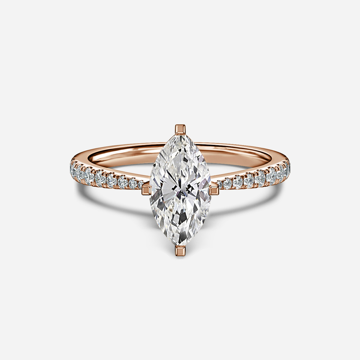 A rose gold pave taper engagement ring has a multiple small stones set into the band that gradually thin as it leads up to the center stone. Handcrafted in Hatton Garden, London Centre Diamond Not Included Setting Only