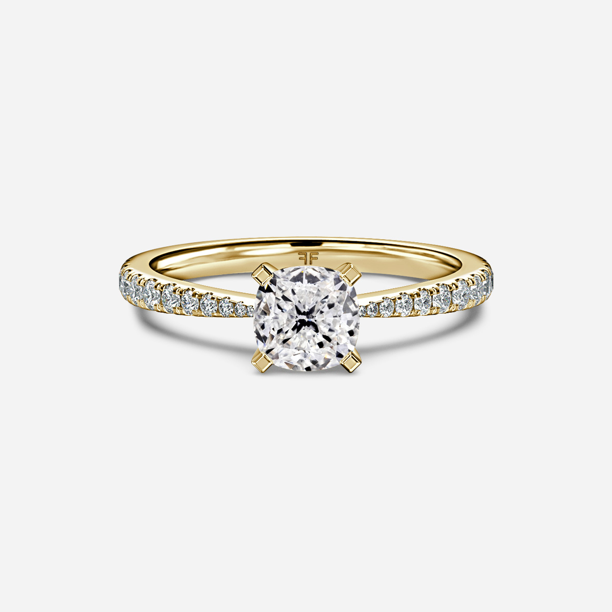 A yellow gold pave taper engagement ring has a multiple small stones set into the band that gradually thin as it leads up to the center stone. Handcrafted in Hatton Garden, London Centre Diamond Not Included Setting Only
