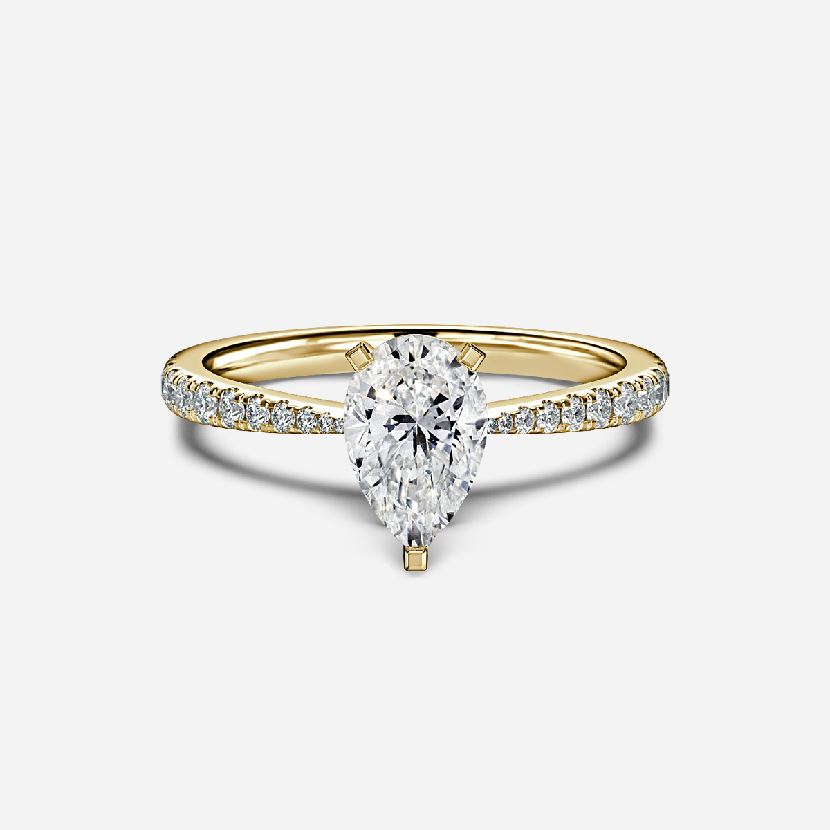 A yellow gold pave taper engagement ring has a multiple small stones set into the band that gradually thin as it leads up to the center stone. Handcrafted in Hatton Garden, London Centre Diamond Not Included Setting Only