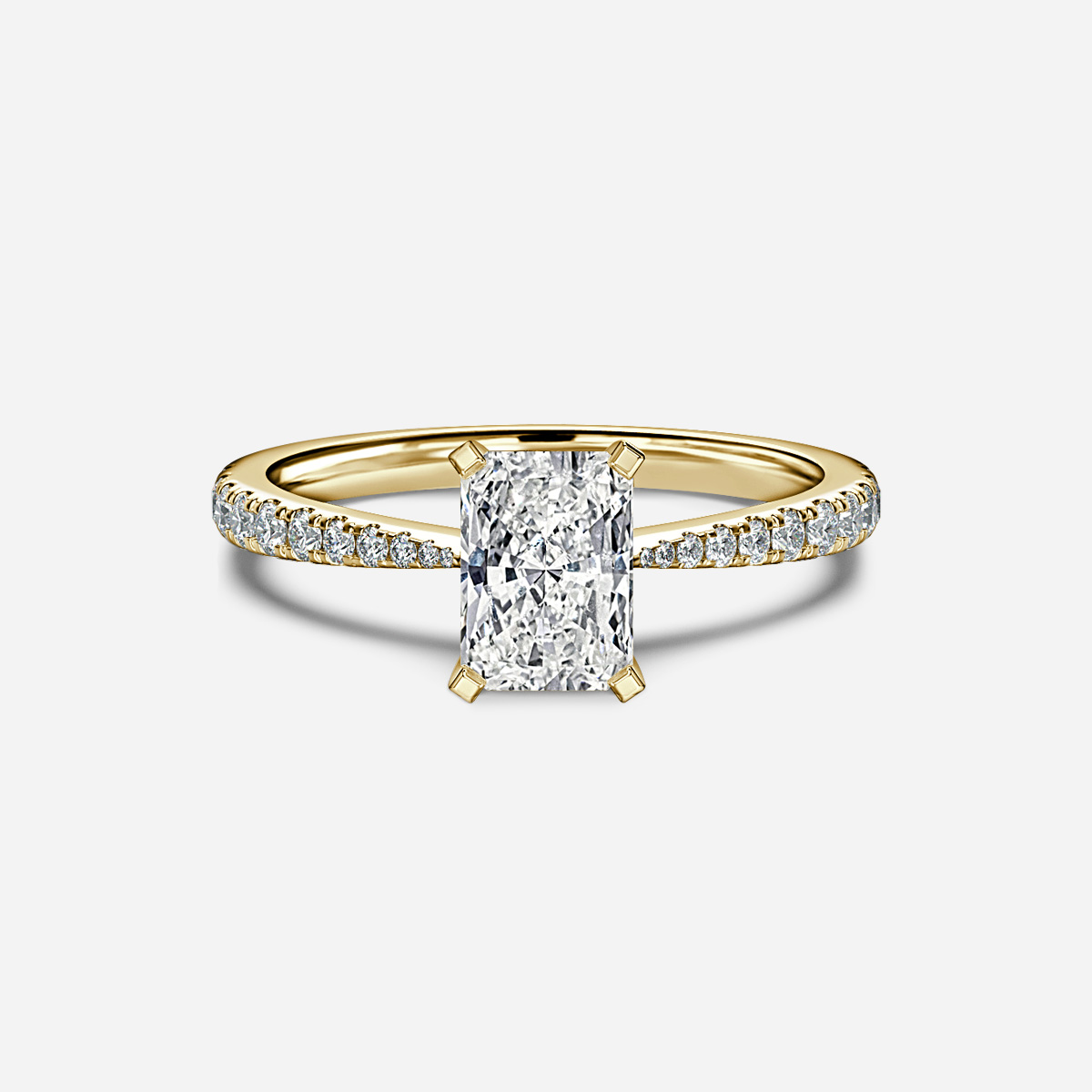 A yellow gold pave taper engagement ring has a multiple small stones set into the band that gradually thin as it leads up to the center stone. Handcrafted in Hatton Garden, London Centre Diamond Not Included Setting Only