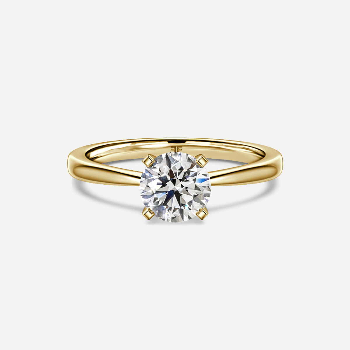 A yellow gold solitaire tapered engagement ring has a band that gradually thin as it leads up to the center stone. Handcrafted in Hatton Garden, London Centre Diamond Not Included Setting Only