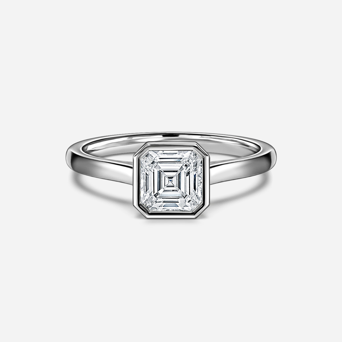 The Georgia White Gold Bezel Engagement Ring features a sleek and modern design with a U-shaped basket elegantly supporting the center stone, creating a striking and timeless look. Its polished white gold band adds a touch of luxury, making it a perfect choice for a unique engagement. Handcrafted in Hatton Gardens, London. Centre Diamond Not Included Setting Only