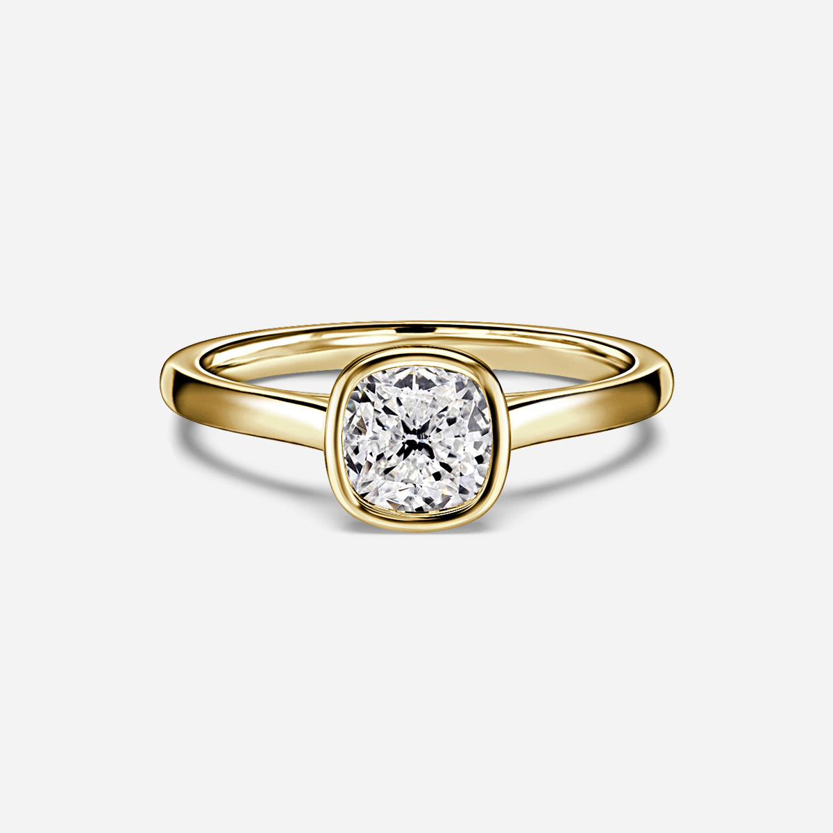 The Georgia Yellow Gold Bezel Engagement Ring features a sleek and modern design with a U-shaped basket elegantly supporting the center stone, creating a striking and timeless look. Its polished yellow gold band adds a touch of luxury, making it a perfect choice for a unique engagement. Handcrafted in Hatton Gardens, London. Centre Diamond Not Included Setting Only