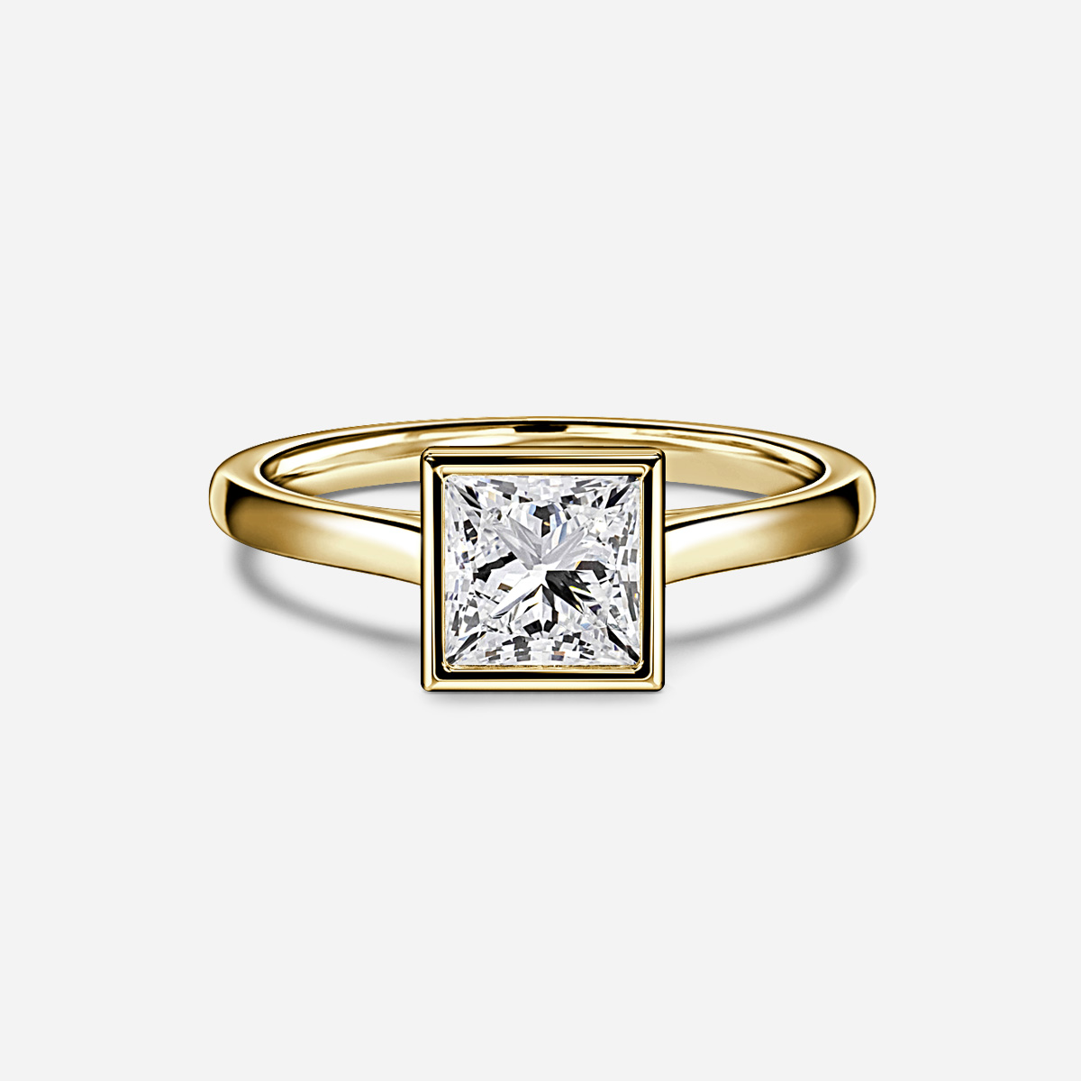 The Georgia Yellow Gold Bezel Engagement Ring features a sleek and modern design with a U-shaped basket elegantly supporting the center stone, creating a striking and timeless look. Its polished yellow gold band adds a touch of luxury, making it a perfect choice for a unique engagement. Handcrafted in Hatton Gardens, London. Centre Diamond Not Included Setting Only