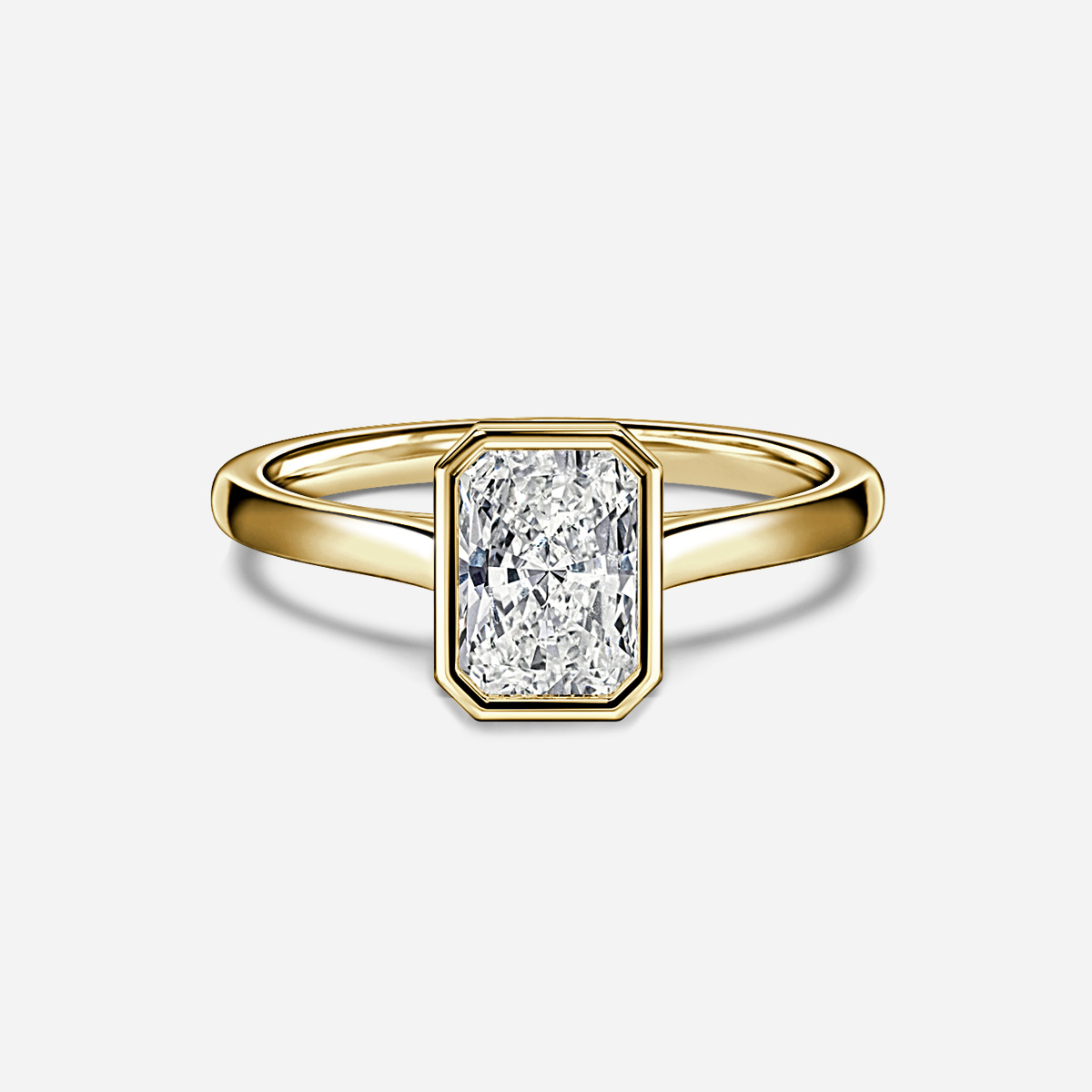 The Georgia Yellow Gold Bezel Engagement Ring features a sleek and modern design with a U-shaped basket elegantly supporting the center stone, creating a striking and timeless look. Its polished yellow gold band adds a touch of luxury, making it a perfect choice for a unique engagement. Handcrafted in Hatton Gardens, London. Centre Diamond Not Included Setting Only