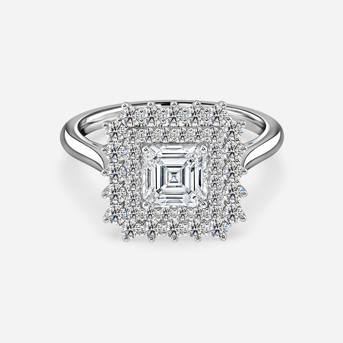 A double Halo Engagement ring features a dazzling center diamond encircled by two distinct halos of smaller diamonds, creating a breathtaking display of brilliance and elegance. Handcrafted in Hatton Gardens, London. Centre Diamond Not Included Setting Only