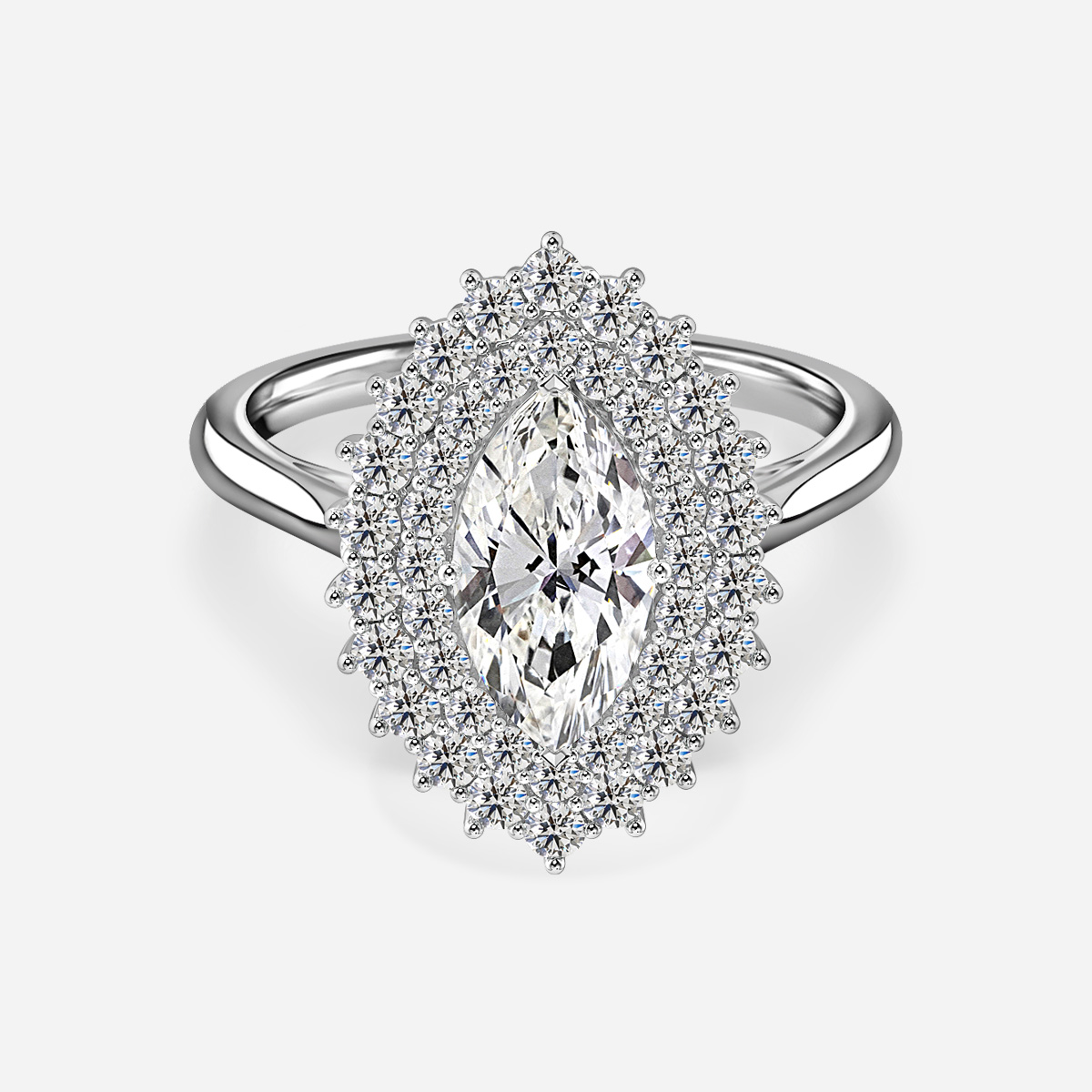 A double Halo Engagement ring features a dazzling center diamond encircled by two distinct halos of smaller diamonds, creating a breathtaking display of brilliance and elegance. Handcrafted in Hatton Gardens, London. Centre Diamond Not Included Setting Only