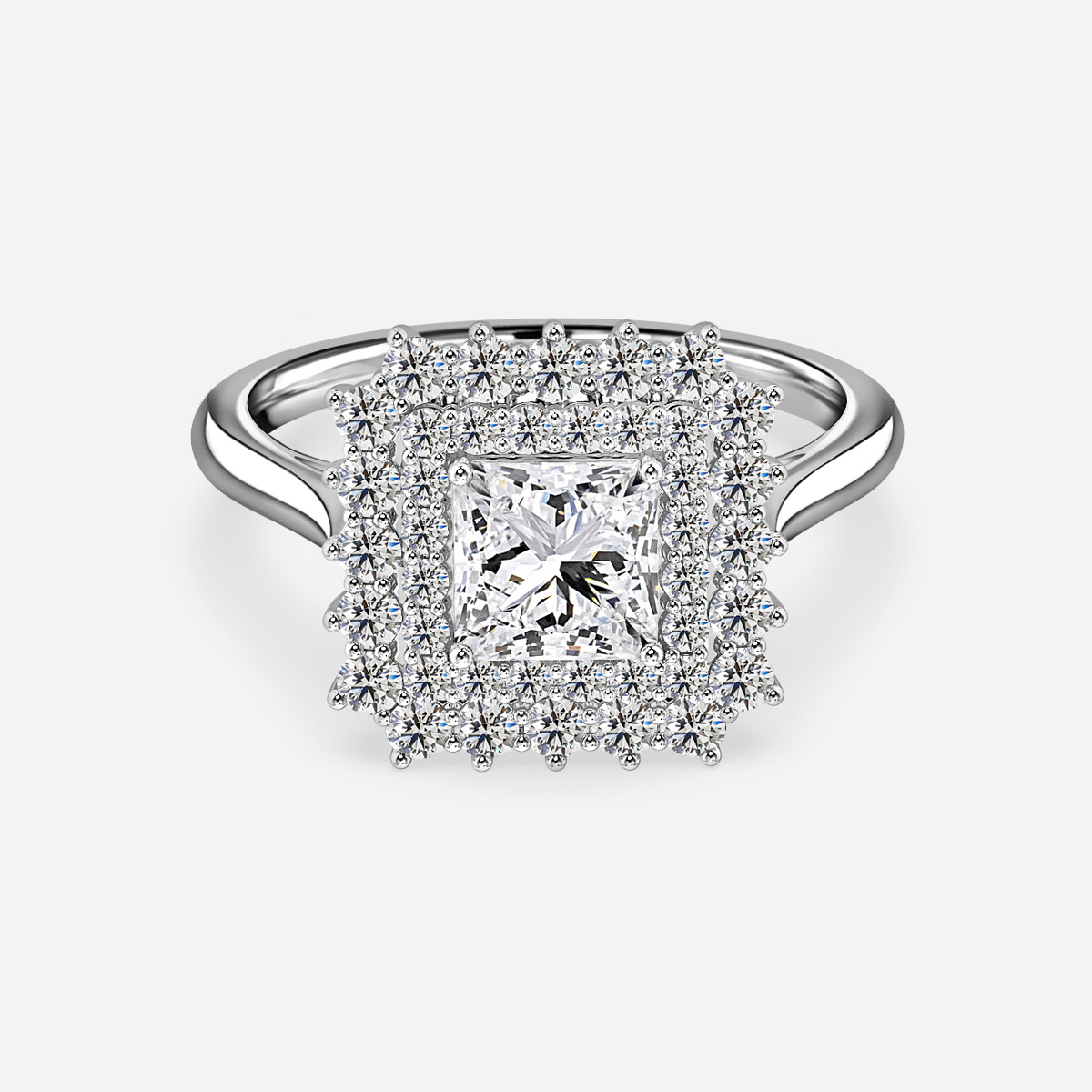 A double Halo Engagement ring features a dazzling center diamond encircled by two distinct halos of smaller diamonds, creating a breathtaking display of brilliance and elegance. Handcrafted in Hatton Gardens, London. Centre Diamond Not Included Setting Only