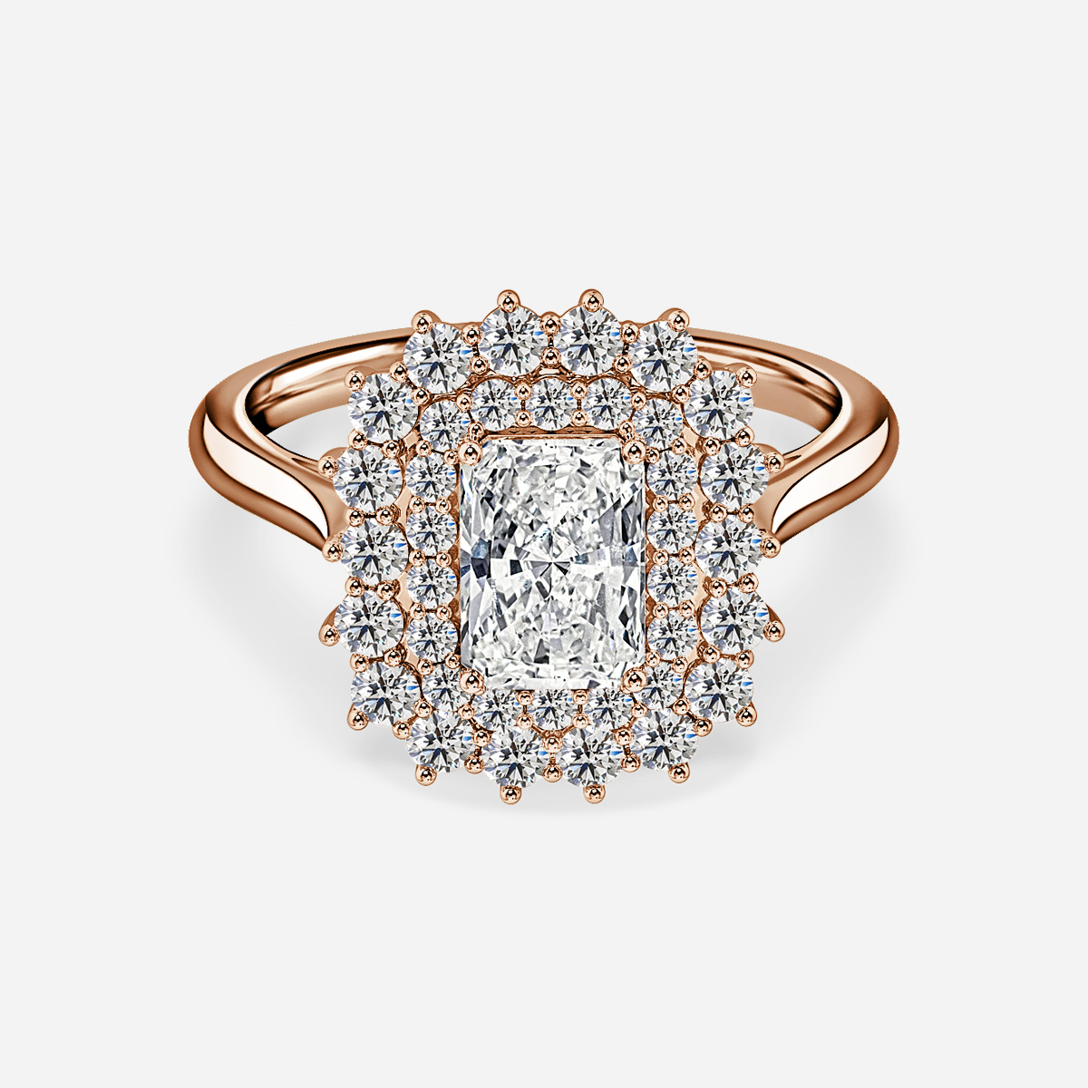 A double Halo Engagement ring features a dazzling center diamond encircled by two distinct halos of smaller diamonds, creating a breathtaking display of brilliance and elegance. Handcrafted in Hatton Gardens, London. Centre Diamond Not Included Setting Only