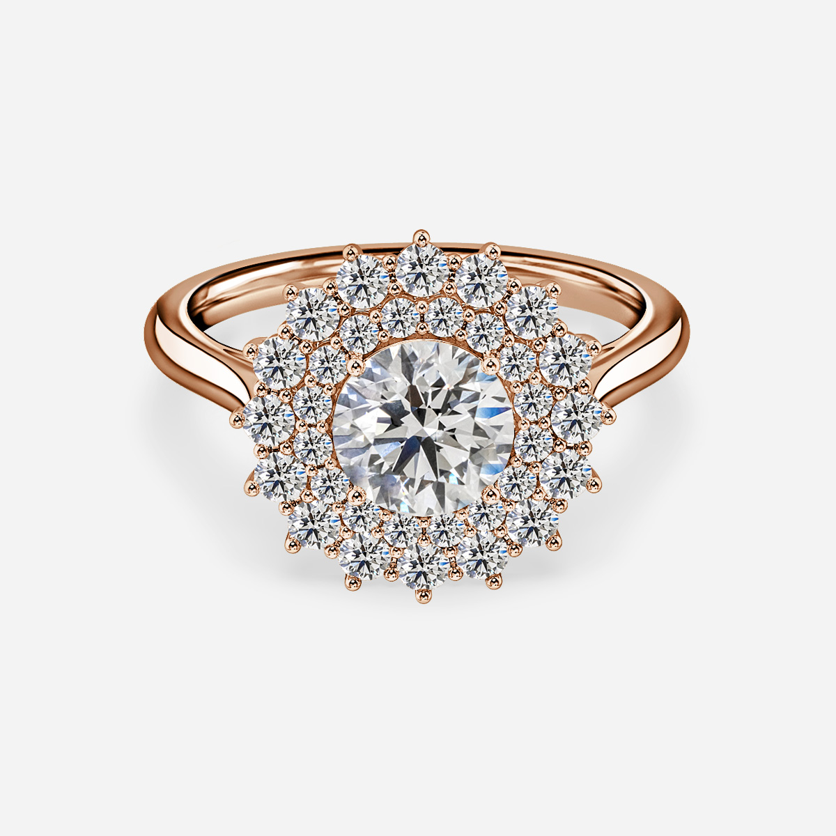 A double Halo Engagement ring features a dazzling center diamond encircled by two distinct halos of smaller diamonds, creating a breathtaking display of brilliance and elegance. Handcrafted in Hatton Gardens, London. Centre Diamond Not Included Setting Only
