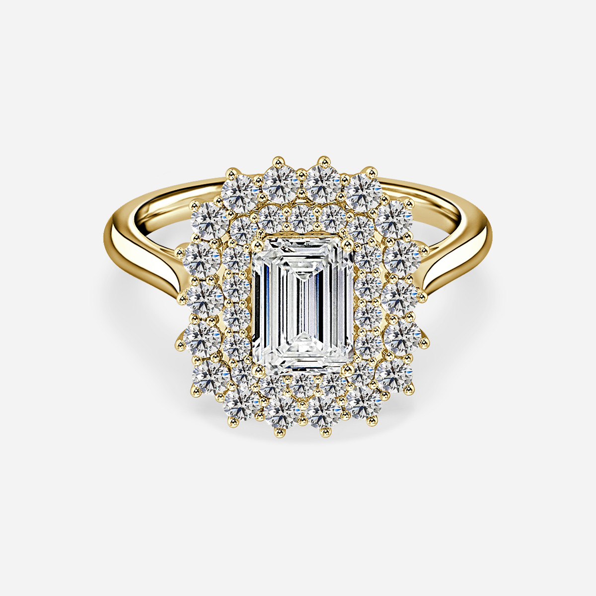 A double Halo Engagement ring features a dazzling center diamond encircled by two distinct halos of smaller diamonds, creating a breathtaking display of brilliance and elegance. Handcrafted in Hatton Gardens, London. Centre Diamond Not Included Setting Only