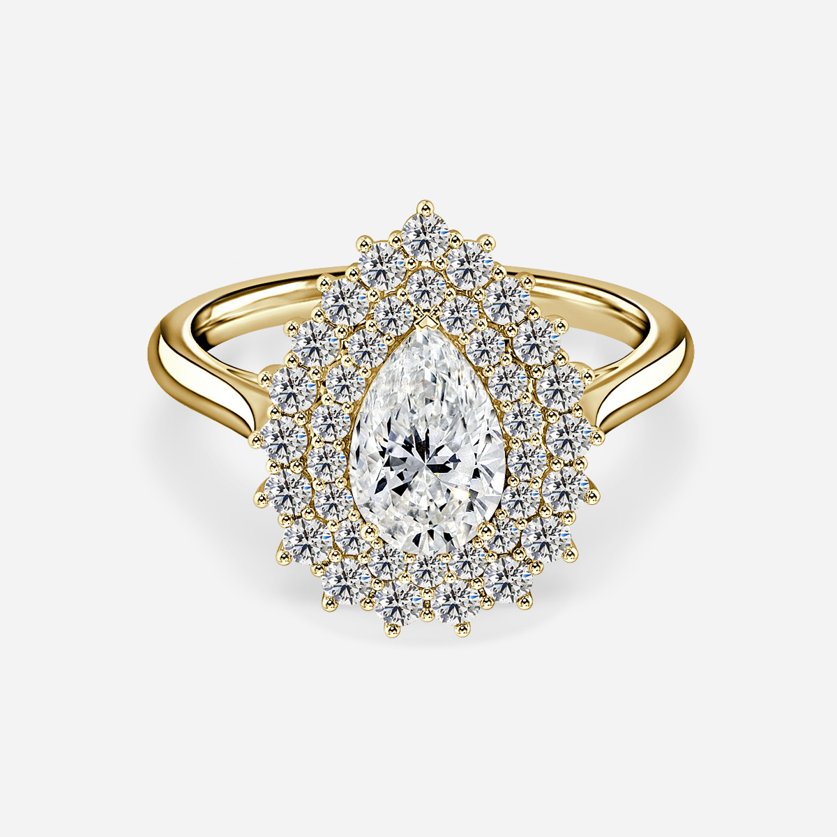 A double Halo Engagement ring features a dazzling center diamond encircled by two distinct halos of smaller diamonds, creating a breathtaking display of brilliance and elegance. Handcrafted in Hatton Gardens, London. Centre Diamond Not Included Setting Only