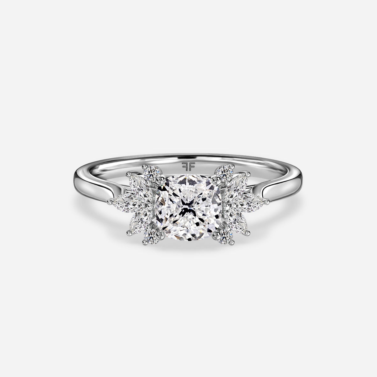 Exuding timeless elegance, the Holly Platinum Cluster Engagement Ring showcases a captivating design. Three sets of marquise diamonds gracefully cradle a central stone, while two round diamonds on either side enhance its brilliance and allure. Crafted with meticulous attention to detail, this ring epitomizes sophistication and romance, making it a cherished symbol of love and commitment. Handcrafted in Hatton Gardens, London. Centre Diamond Not Included Setting only