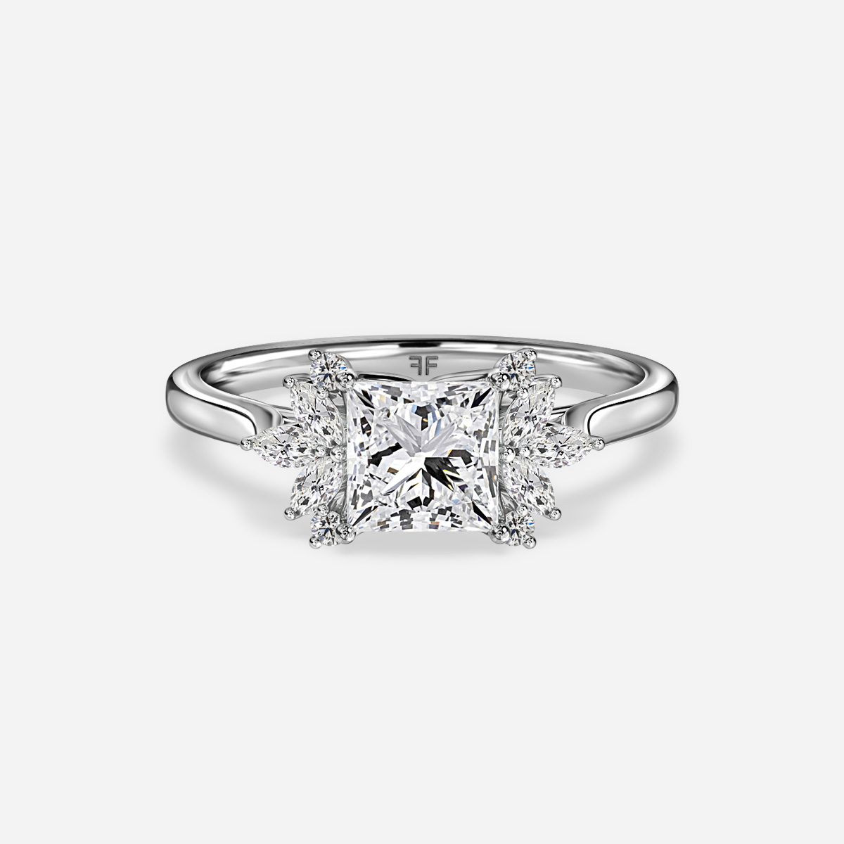 Exuding timeless elegance, the Holly White Gold Cluster Engagement Ring showcases a captivating design. Three sets of marquise diamonds gracefully cradle a central stone, while two round diamonds on either side enhance its brilliance and allure. Crafted with meticulous attention to detail, this ring epitomizes sophistication and romance, making it a cherished symbol of love and commitment. Handcrafted in Hatton Gardens, London. Centre Diamond Not Included Setting only