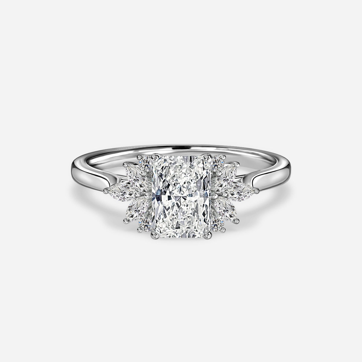 Exuding timeless elegance, the Holly White Gold Cluster Engagement Ring showcases a captivating design. Three sets of marquise diamonds gracefully cradle a central stone, while two round diamonds on either side enhance its brilliance and allure. Crafted with meticulous attention to detail, this ring epitomizes sophistication and romance, making it a cherished symbol of love and commitment. Handcrafted in Hatton Gardens, London. Centre Diamond Not Included Setting only