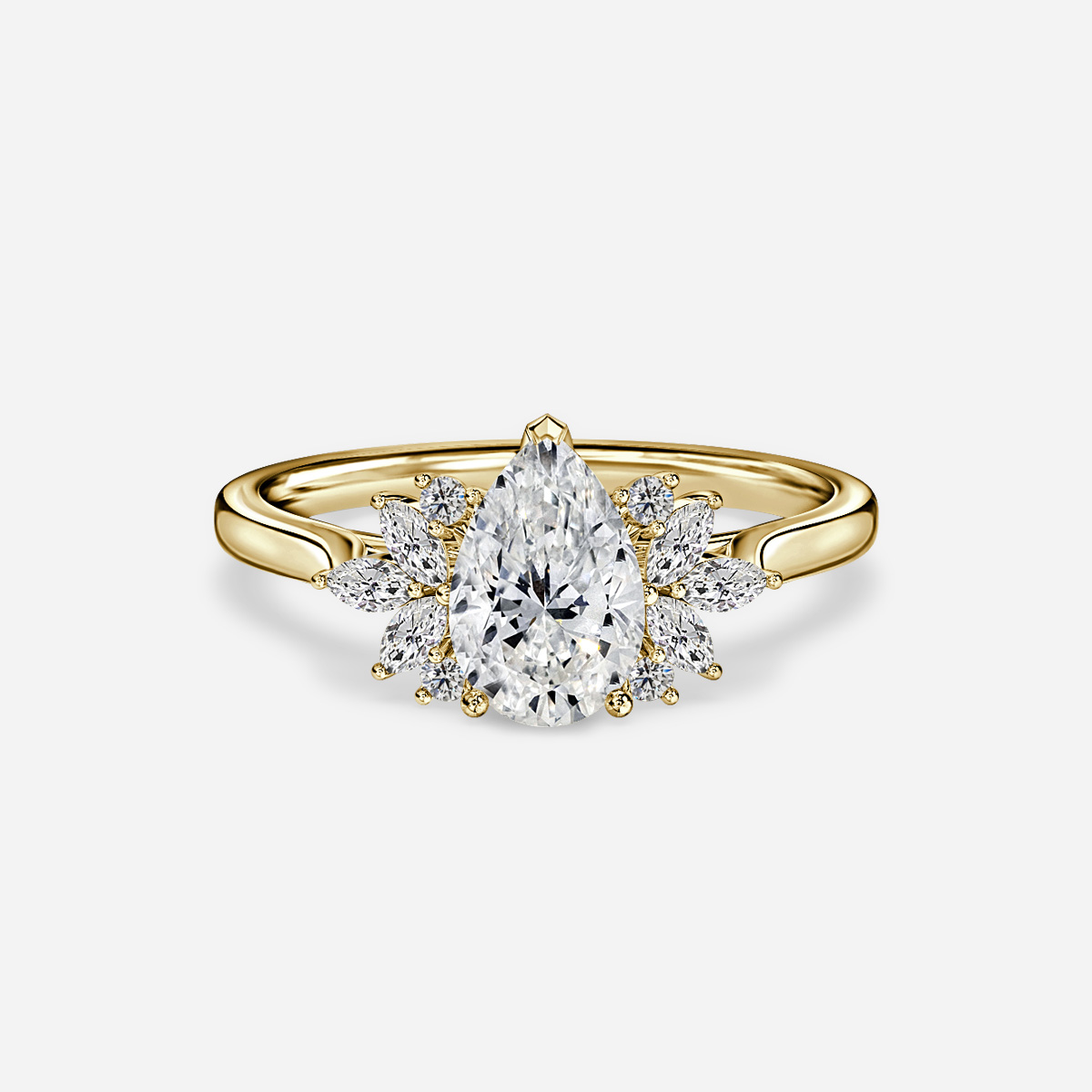 Exuding timeless elegance, the Holly Yellow Gold Cluster Engagement Ring showcases a captivating design. Three sets of marquise diamonds gracefully cradle a central stone, while two round diamonds on either side enhance its brilliance and allure. Crafted with meticulous attention to detail, this ring epitomizes sophistication and romance, making it a cherished symbol of love and commitment. Handcrafted in Hatton Gardens, London. Centre Diamond Not Included Setting only