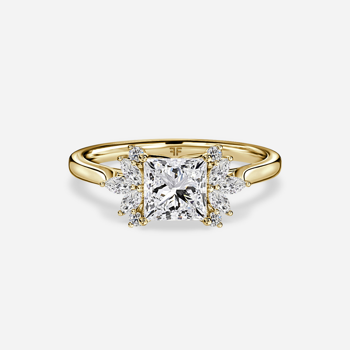 Exuding timeless elegance, the Holly Yellow Gold Cluster Engagement Ring showcases a captivating design. Three sets of marquise diamonds gracefully cradle a central stone, while two round diamonds on either side enhance its brilliance and allure. Crafted with meticulous attention to detail, this ring epitomizes sophistication and romance, making it a cherished symbol of love and commitment. Handcrafted in Hatton Gardens, London. Centre Diamond Not Included Setting only