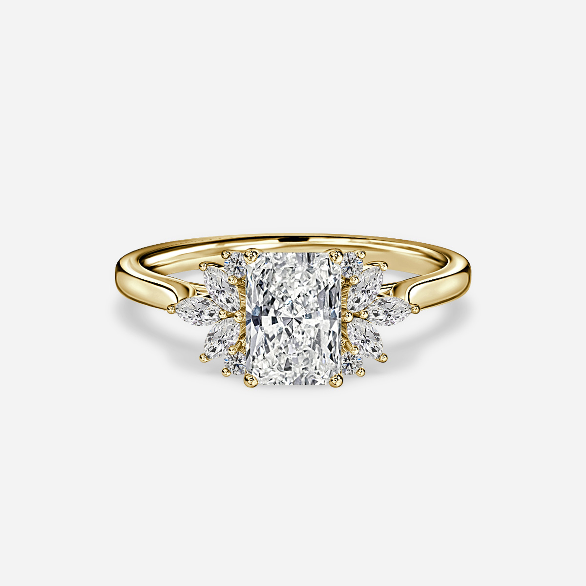 Exuding timeless elegance, the Holly Yellow Gold Cluster Engagement Ring showcases a captivating design. Three sets of marquise diamonds gracefully cradle a central stone, while two round diamonds on either side enhance its brilliance and allure. Crafted with meticulous attention to detail, this ring epitomizes sophistication and romance, making it a cherished symbol of love and commitment. Handcrafted in Hatton Gardens, London. Centre Diamond Not Included Setting only