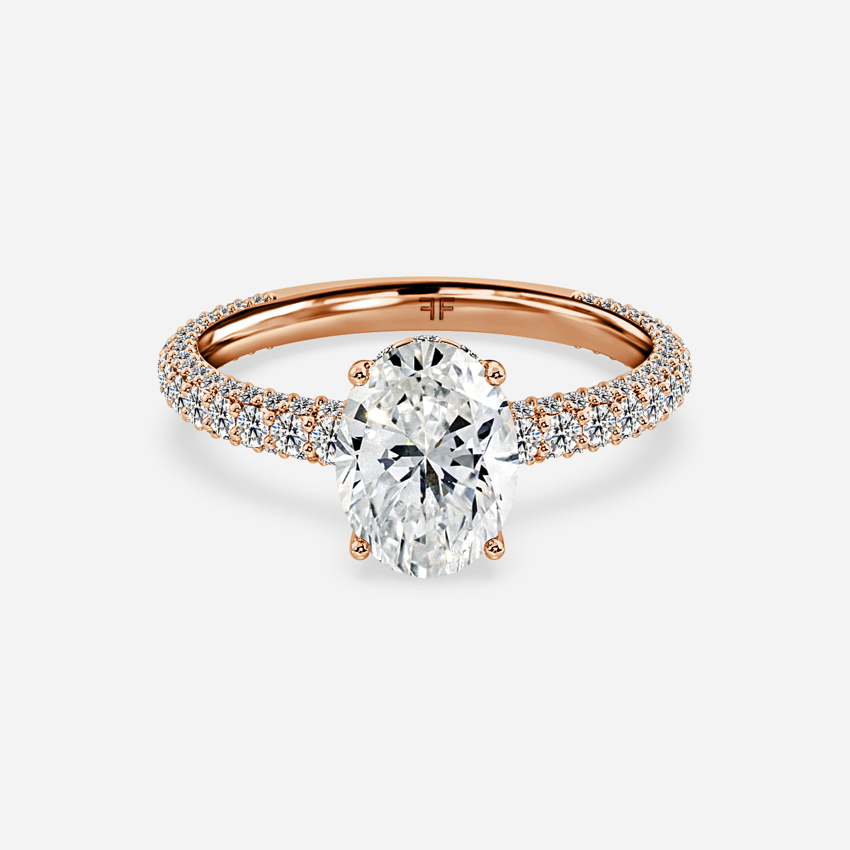 This rose gold hidden halo engagement ring is a stunning and sophisticated piece of jewelry crafted from high-quality rose gold. This ring features a hidden halo design encrusted with sparkling diamonds on the band, adding glamour to the elegant and timeless design Handcrafted in Hatton Gardens, London. Setting only.