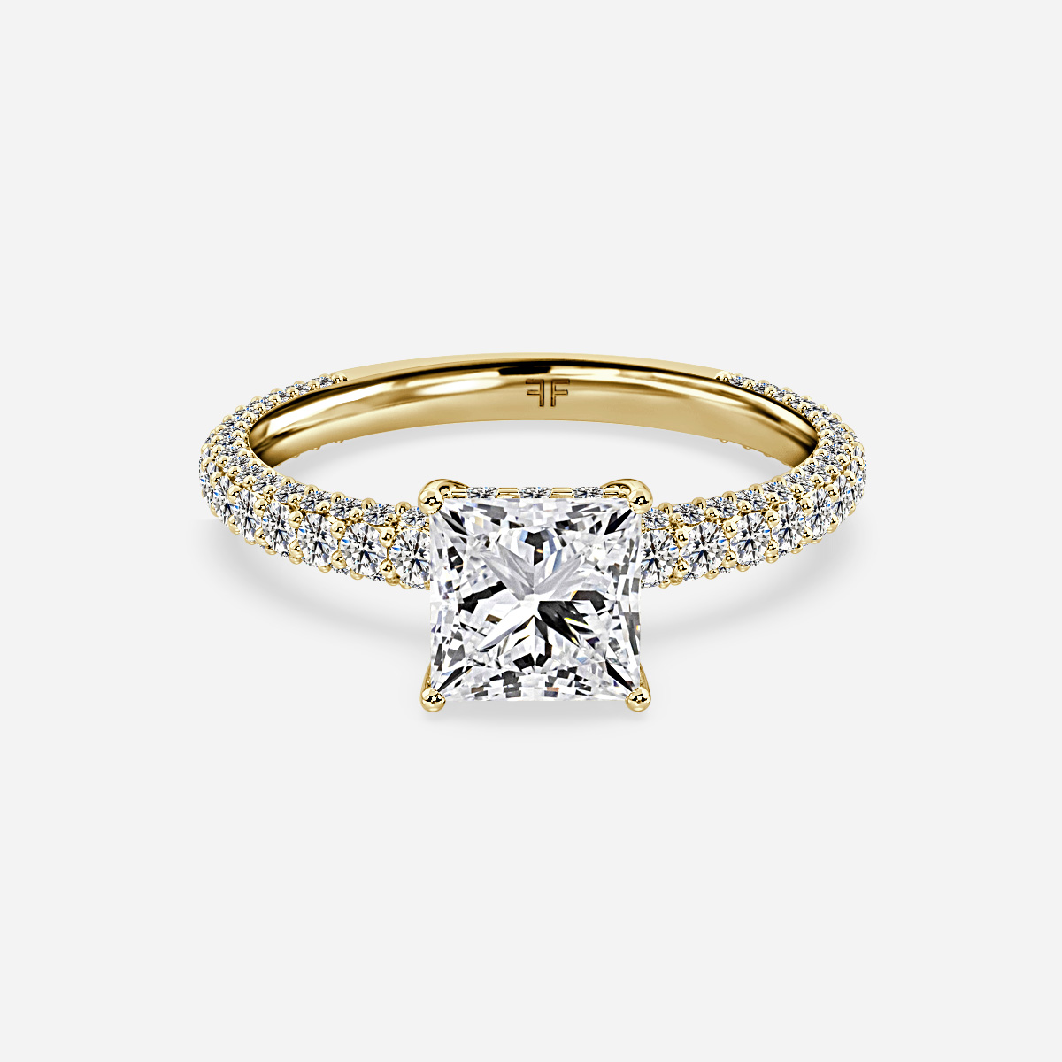This yellow gold hidden halo engagement ring is a stunning and sophisticated piece of jewelry crafted from high-quality yellow gold. This ring features a hidden halo design encrusted with sparkling diamonds on the band, adding glamour to the elegant and timeless design Handcrafted in Hatton Gardens, London. Setting only.