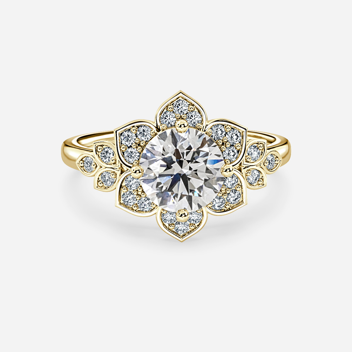 A round floral halo engagement ring is a stunning piece of jewelry that features a round-shaped center diamond surrounded by smaller diamonds arranged in a floral halo design. It's a popular choice for brides who want a classic and timeless ring with a touch of vintage elegance. Handcrafted in Hatton Garden, London Centre Diamond Not Included Setting Only