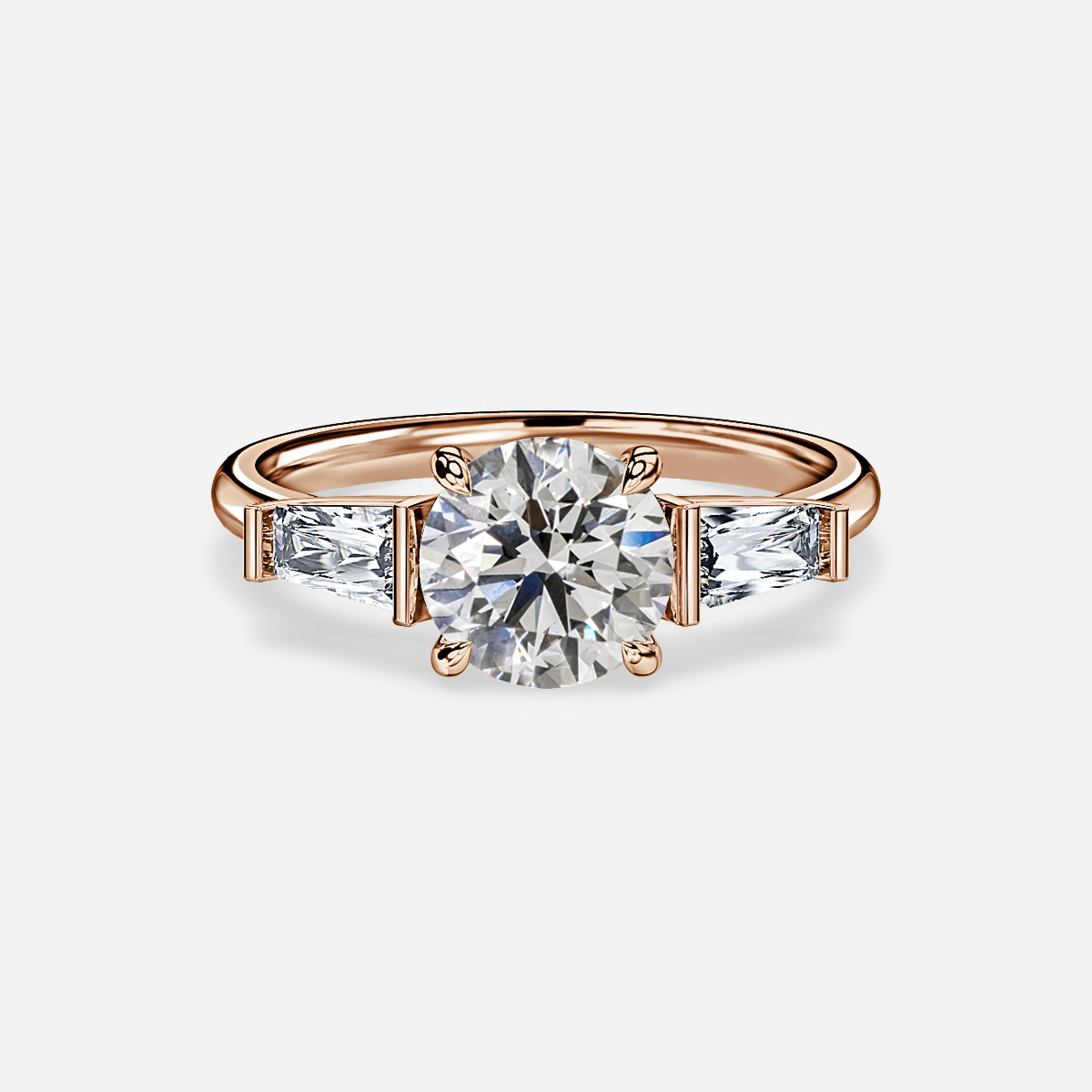 A rose gold three stone engagement ring is held in a classic four-prong setting and accented by 0.30ct two tapered baguette diamonds. Handcrafted in Hatton Gardens, London. Centre Diamond Not Included Setting Only