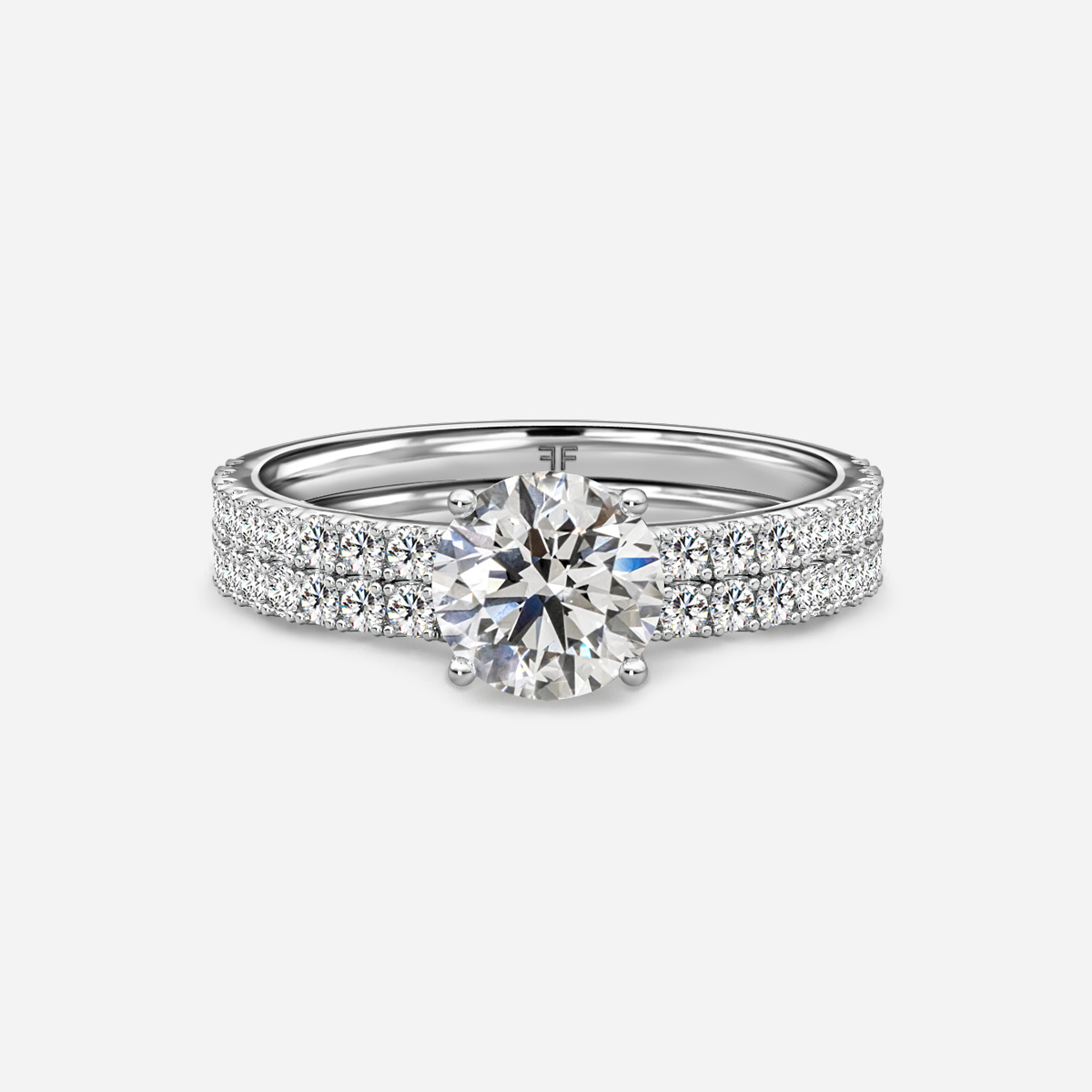 The Jennifer White Gold Pavé Band Bridal Set features a mesmerizing hidden halo engagement ring with a floating center diamond, complemented by a matching diamond-studded wedding band for a harmonious and glamorous look. This exquisite set combines timeless elegance with innovative design, making it a perfect symbol of enduring love and commitment. Handcrafted in Hatton Garden, London Centre Diamond Not Included Setting Only