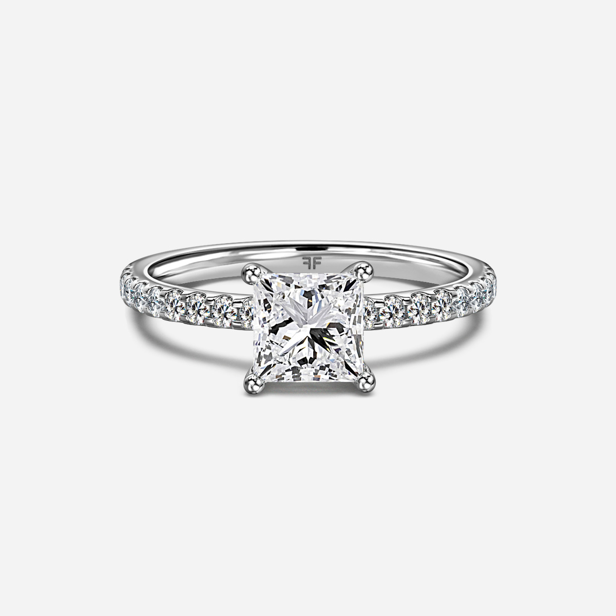 The Jessica offers a sleek modern look, the floating collet gently resting atop a bed of sparkling diamonds. A design perfect for any stone shape to come to life in your hands. Handcrafted in Hatton Garden, London. Centre Diamond Not Included, Setting Only.