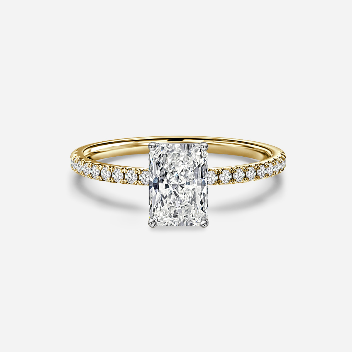 A classic Jessica yellow gold two tone engagement ring crafted in traditional yellow gold, showcase a center diamond. Supported by four prongs and pavé-set diamonds. Handcrafted in Hatton Garden, London Centre Diamond Not Included Setting Only