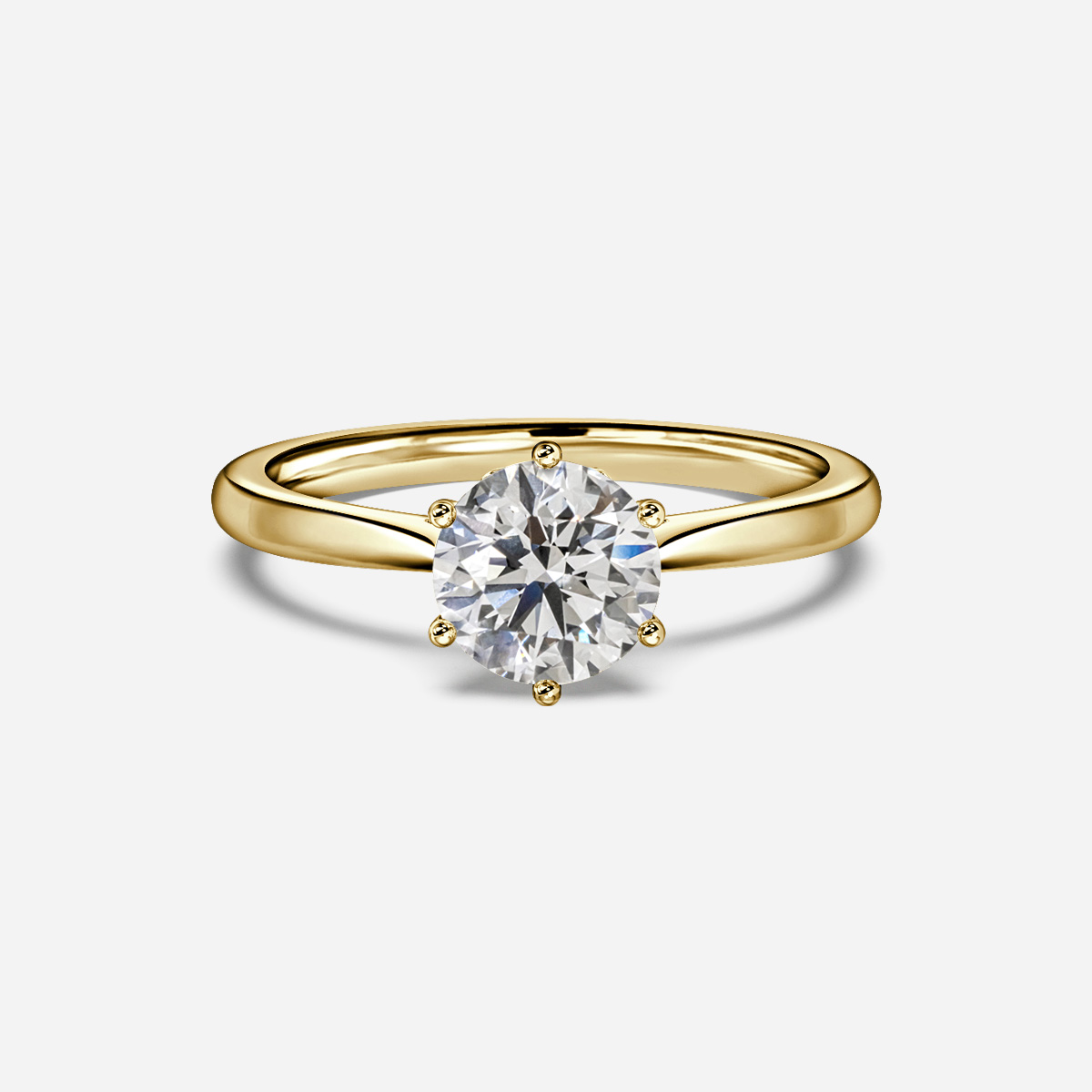 This Jessie Six Claw Tulip Yellow Gold Solitaire Engagement Ring blends timeless elegance with a modern touch, showcasing a tulip-shaped setting and six claws that securely embrace a brilliant diamond. Handcrafted in Hatton Garden, London Centre Diamond Not Included Setting Only