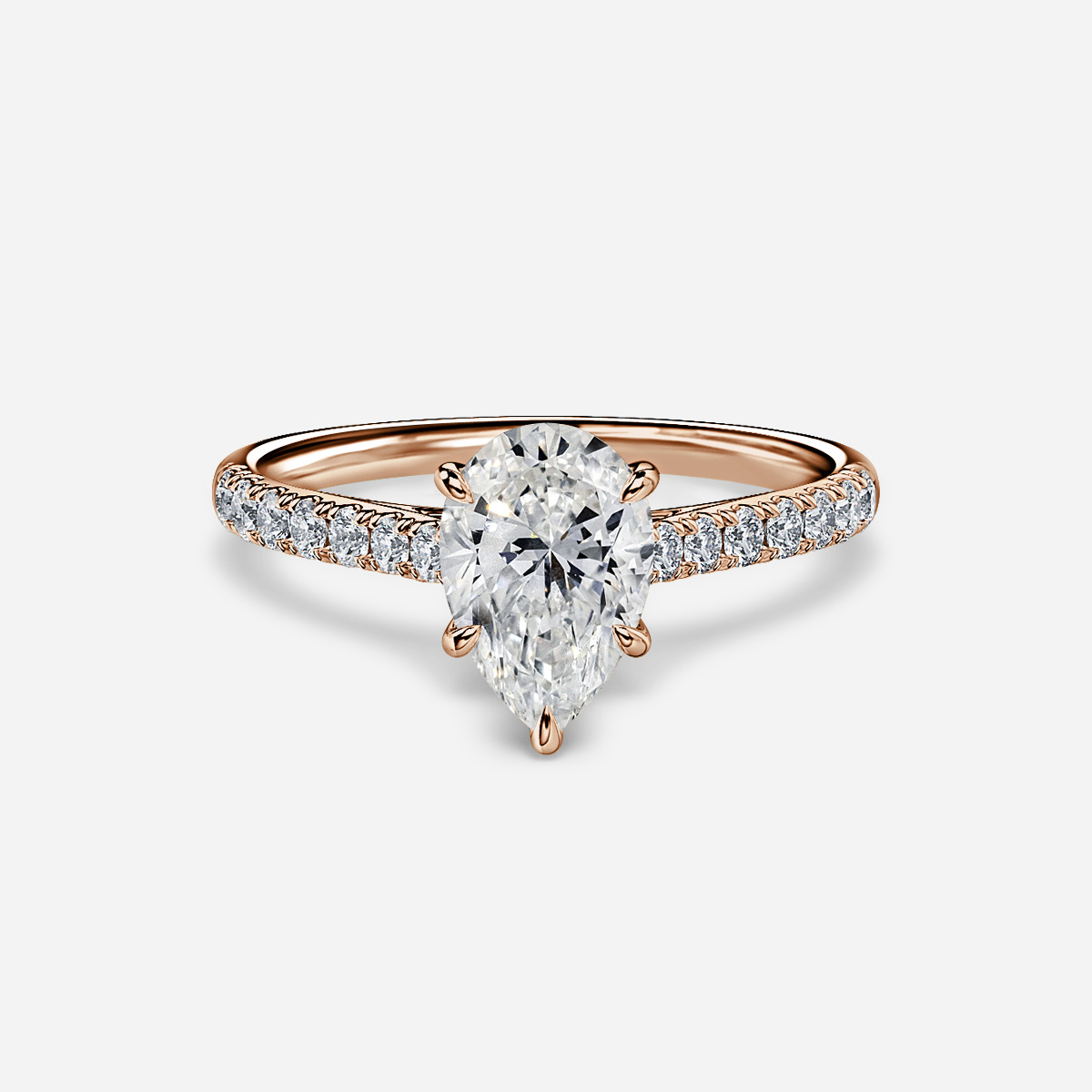 A rose gold tapered diamond engagement ring features a classic claw setting, complemented by graceful micro-set round diamond shoulder stones. Handcrafted in Hatton Garden, London Centre Diamond Not Included Setting Only
