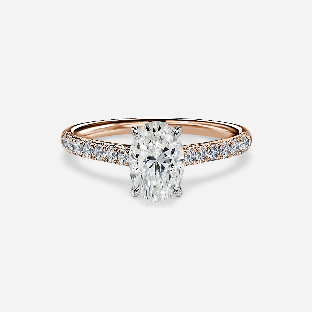 A rose gold two tone tapered diamond engagement ring features a classic claw setting, complemented by graceful micro-set round diamond shoulder stones. Handcrafted in Hatton Garden, London Centre Diamond Not Included Setting Only