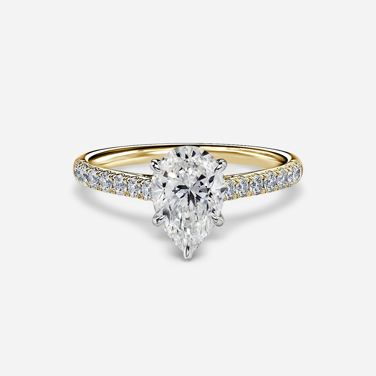 A yellow gold two tone tapered diamond engagement ring features a classic claw setting, complemented by graceful micro-set round diamond shoulder stones. Handcrafted in Hatton Garden, London Centre Diamond Not Included Setting Only