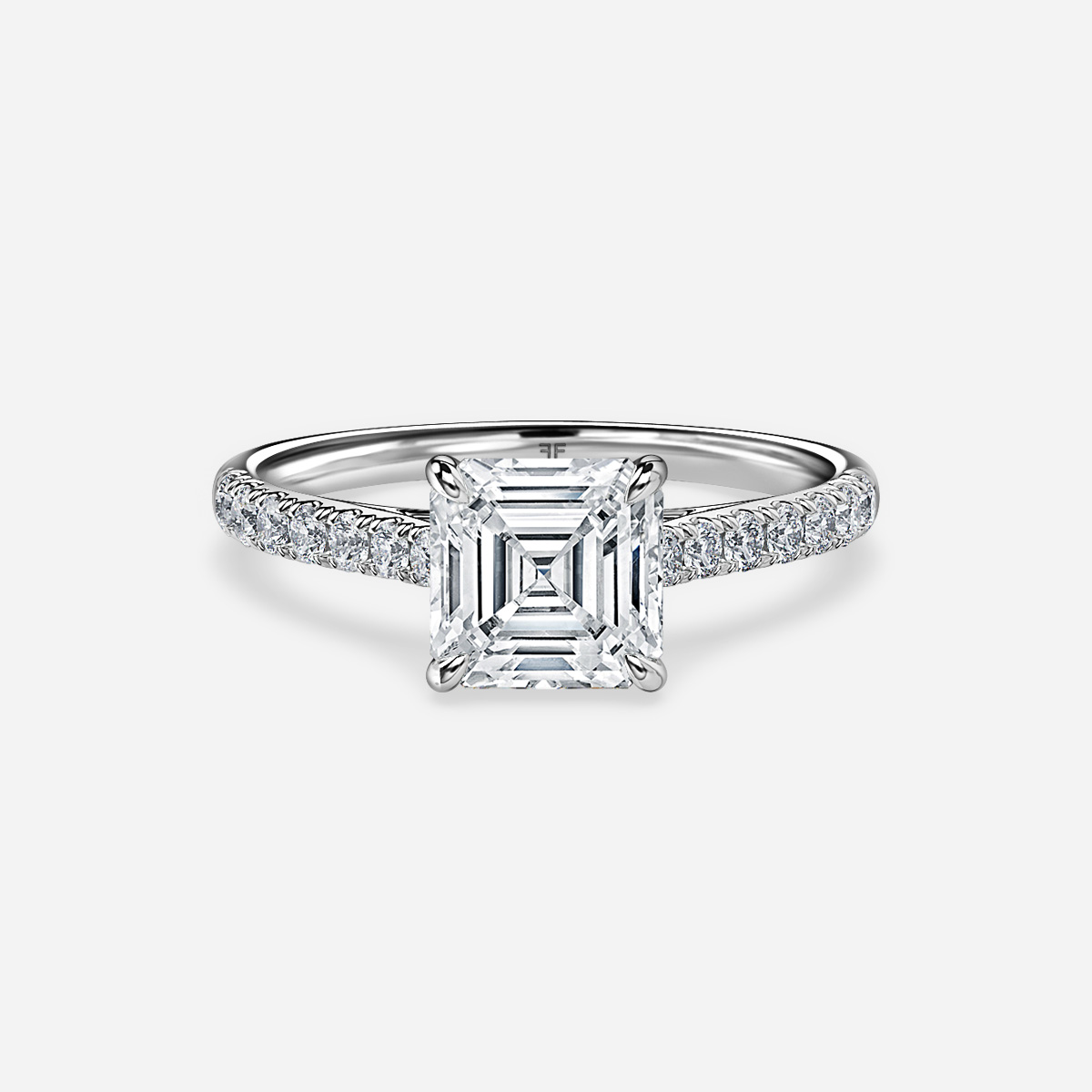 A white gold tapered diamond engagement ring features a classic claw setting, complemented by graceful micro-set round diamond shoulder stones. Handcrafted in Hatton Garden, London Centre Diamond Not Included Setting Only