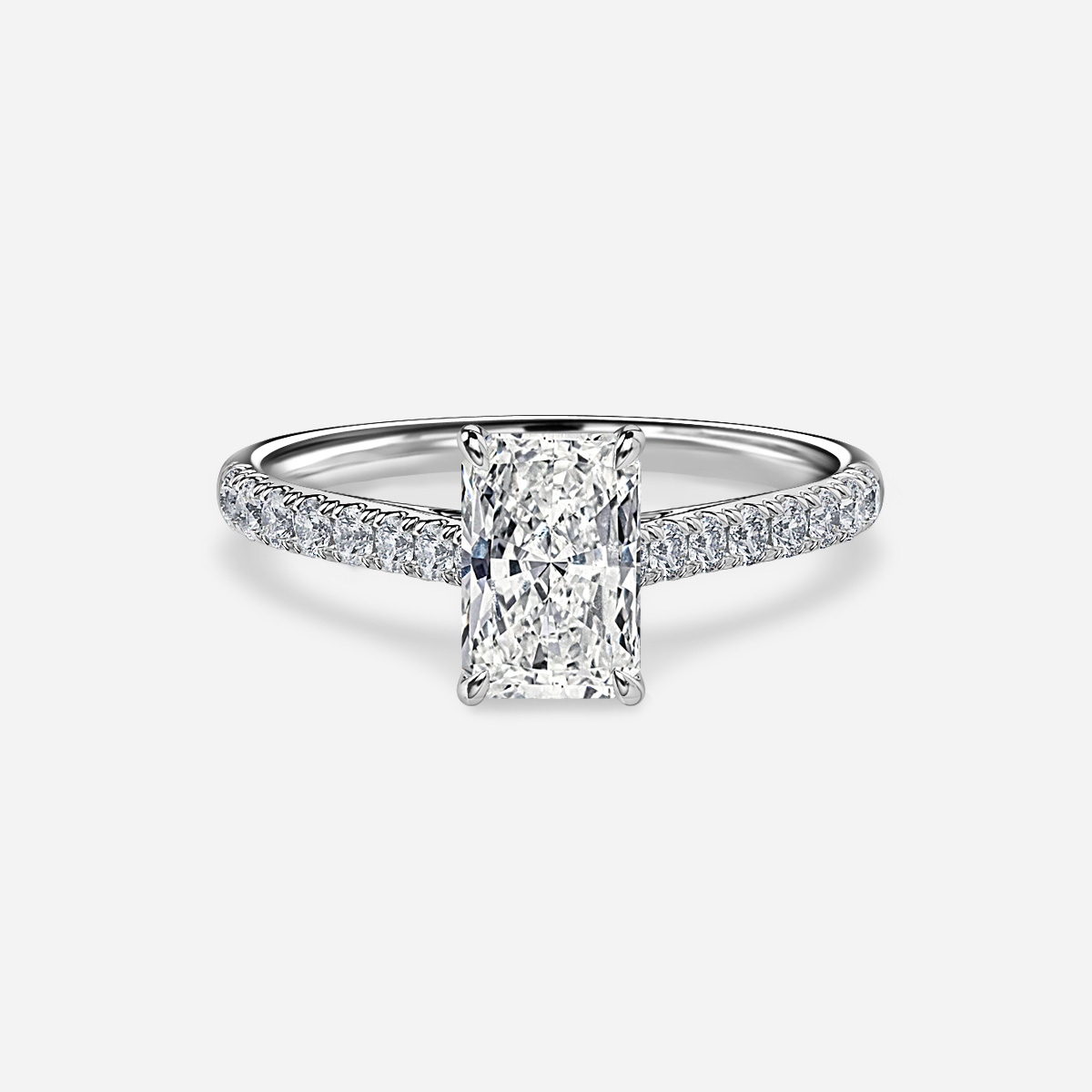 A white gold tapered diamond engagement ring features a classic claw setting, complemented by graceful micro-set round diamond shoulder stones. Handcrafted in Hatton Garden, London Centre Diamond Not Included Setting Only