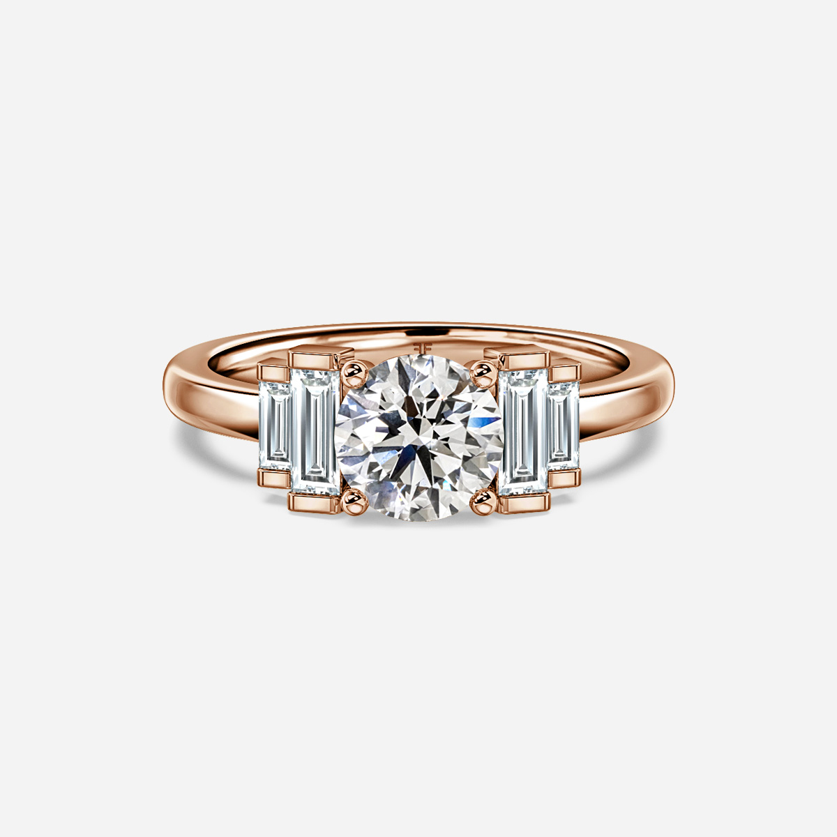 The Kaia ring in rose gold showcases a trilogy setting with two straight baguette diamonds on either side of the centre stone. The warm rose tone adds a subtle touch of colour while keeping the overall design clean and contemporary. Handcrafted in Hatton Garden, London. Centre Diamond Not Included, Setting Only.