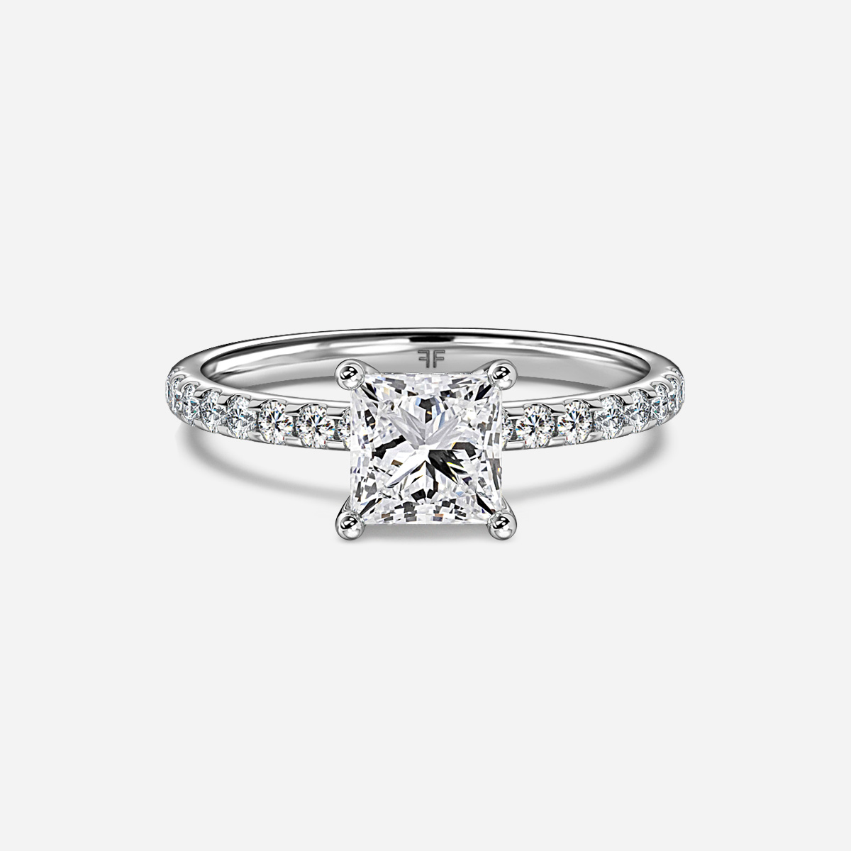 The Kate Platinum Pave Band Hidden Halo Engagement Ring features a dazzling platinum band adorned with delicate pavé-set diamonds, highlighting its timeless elegance. A hidden halo encircles the center stone, adding a subtle yet stunning sparkle from every angle. Handcrafted in Hatton Garden, London. Center Diamond Not Included Setting Only.