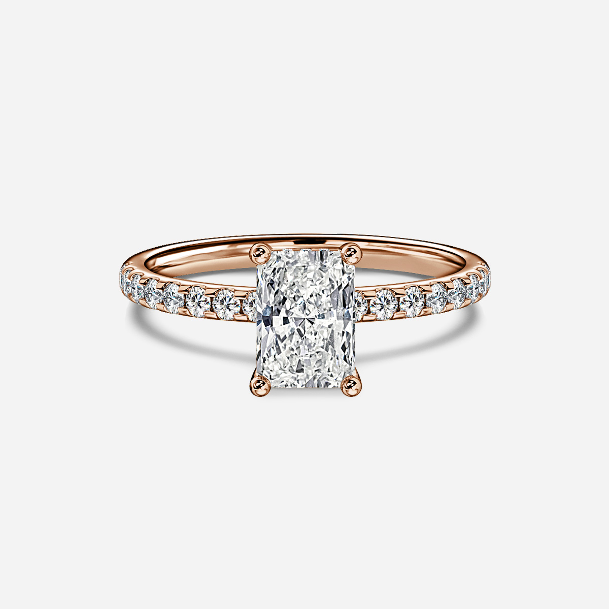 The Kate Rose Gold Pave Band Hidden Halo Engagement Ring features a dazzling rose gold band adorned with delicate pavé-set diamonds, highlighting its timeless elegance. A hidden halo encircles the center stone, adding a subtle yet stunning sparkle from every angle. Handcrafted in Hatton Garden, London. Center Diamond Not Included Setting Only.