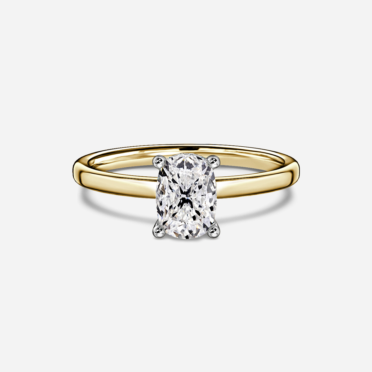 The Kate Two Tone Yellow Gold Engagement Ring boasts a delicate hidden halo of diamonds that encircle the center gemstone. A slender band adds a touch of chic simplicity, perfectly complementing the gallery. A ring that is perfect for those who love understated diamond details and sophisticated solitaire styles. Crafted by hand with recycled Yellow and White 18k Gold in our London, Hatton Garden workshop. The price is for the setting only, the centre diamond is chosen separately.