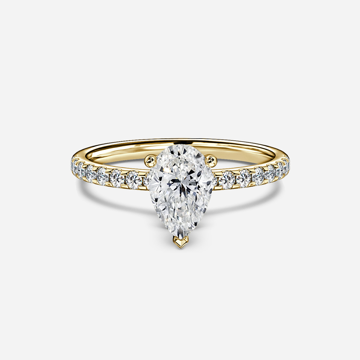 The Kate Yellow Gold Pave Band Hidden Halo Engagement Ring features a dazzling yellow gold band adorned with delicate pavé-set diamonds, highlighting its timeless elegance. A hidden halo encircles the center stone, adding a subtle yet stunning sparkle from every angle. Handcrafted in Hatton Garden, London. Center Diamond Not Included Setting Only