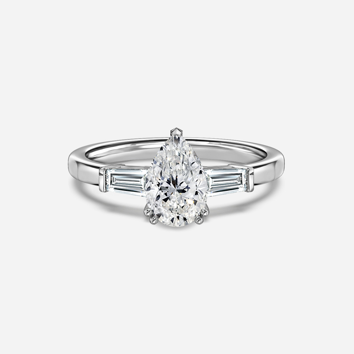 The Kenzo is crafted with two striking tapered baguettes diamond elegantly leading the eye to the brilliant centre stone. Three stone rings have a rich history with each stone symbolising a couple past, present and future, making it perfect to tell your story. Handcrafted in Hatton Garden, London. Centre Diamond Not Included, Setting only.