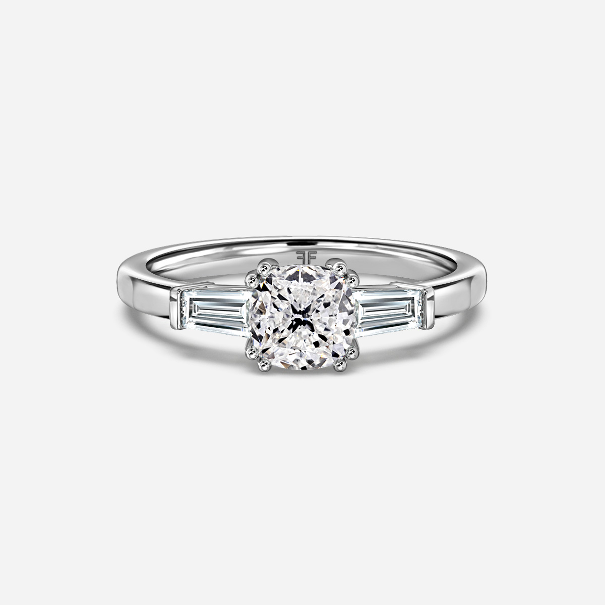The Kenzo is crafted with two striking tapered baguettes diamond elegantly leading the eye to the brilliant centre stone. Three stone rings have a rich history with each stone symbolising a couple past, present and future, making it perfect to tell your story. Handcrafted in Hatton Garden, London. Centre Diamond Not Included, Setting only.