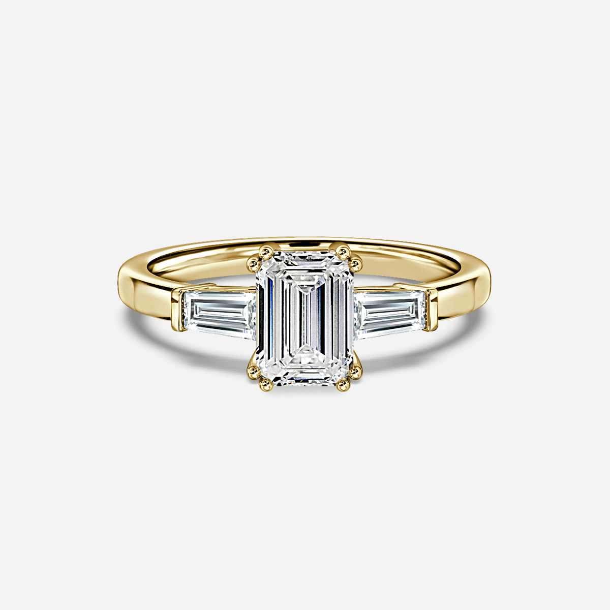 The Kenzo is crafted with two striking tapered baguettes diamond elegantly leading the eye to the brilliant centre stone. Three stone rings have a rich history with each stone symbolising a couple past, present and future, making it perfect to tell your story. Handcrafted in Hatton Garden, London. Centre Diamond Not Included, Setting only.