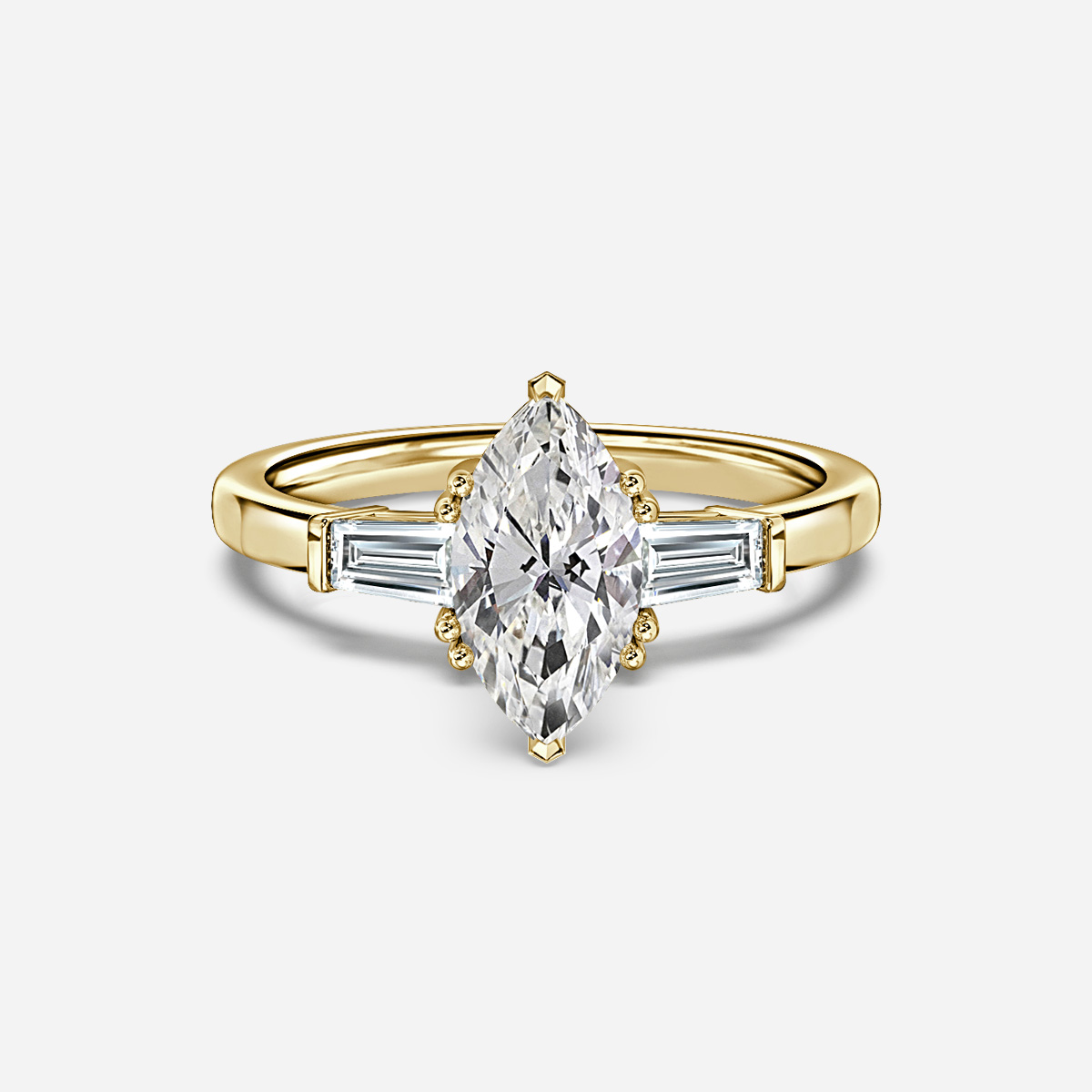 The Kenzo is crafted with two striking tapered baguettes diamond elegantly leading the eye to the brilliant centre stone. Three stone rings have a rich history with each stone symbolising a couple past, present and future, making it perfect to tell your story. Handcrafted in Hatton Garden, London. Centre Diamond Not Included, Setting only.