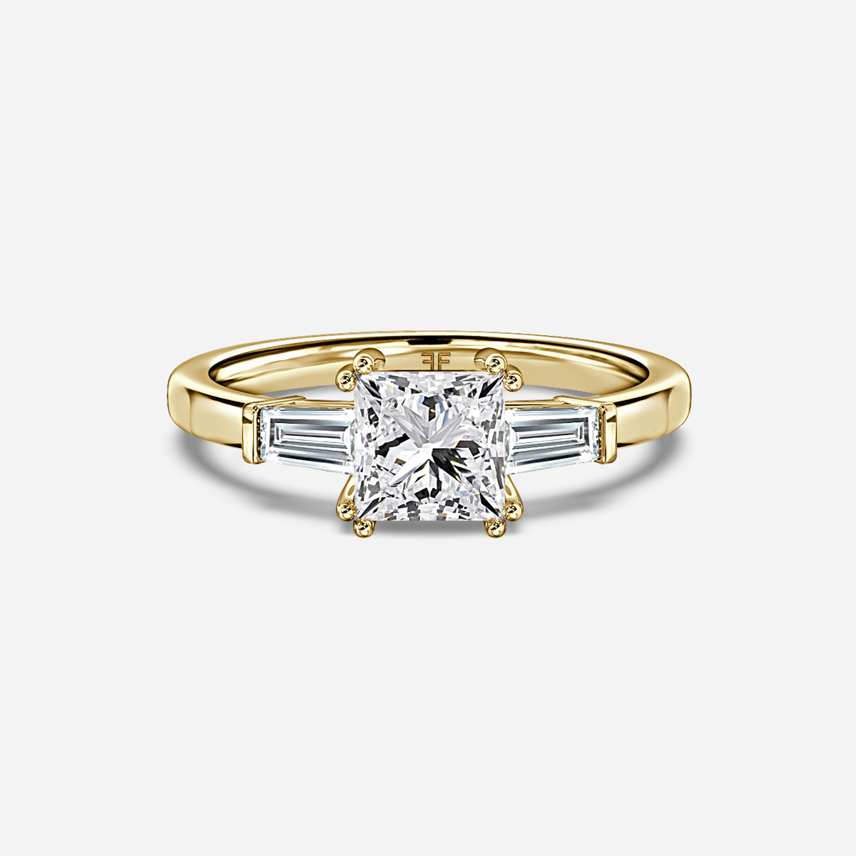 The Kenzo is crafted with two striking tapered baguettes diamond elegantly leading the eye to the brilliant centre stone. Three stone rings have a rich history with each stone symbolising a couple past, present and future, making it perfect to tell your story. Handcrafted in Hatton Garden, London. Centre Diamond Not Included, Setting only.