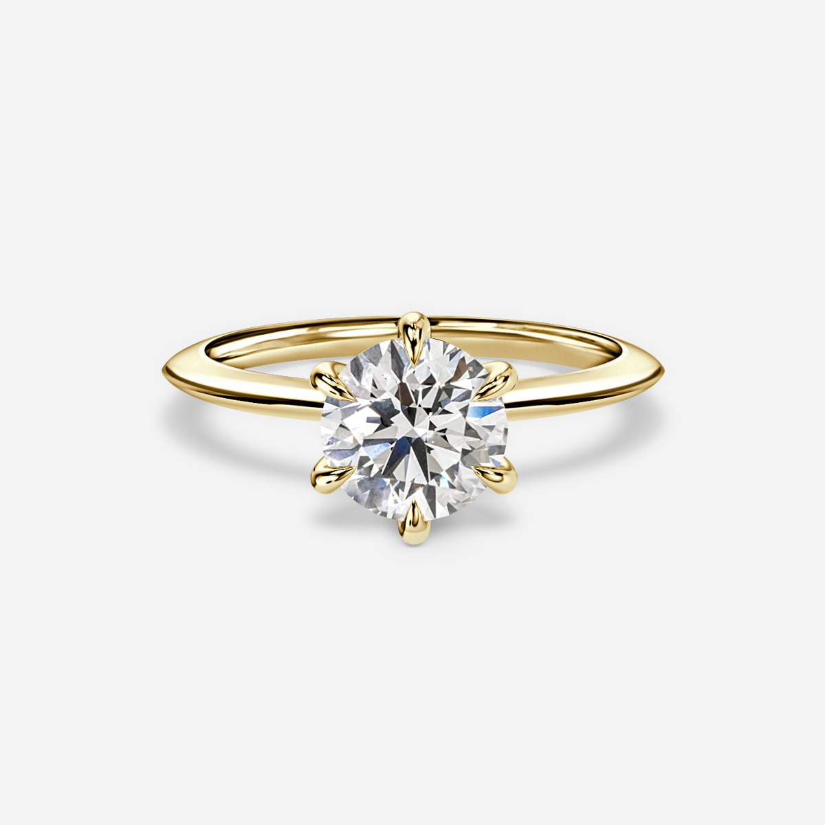Classic and refined, this exquisite yellow gold solitaire engagement ring features an round cut diamond that sits within a six prong setting. Handcrafted in Hatton Gardens, London. Centre Diamond Not Included Setting Only.