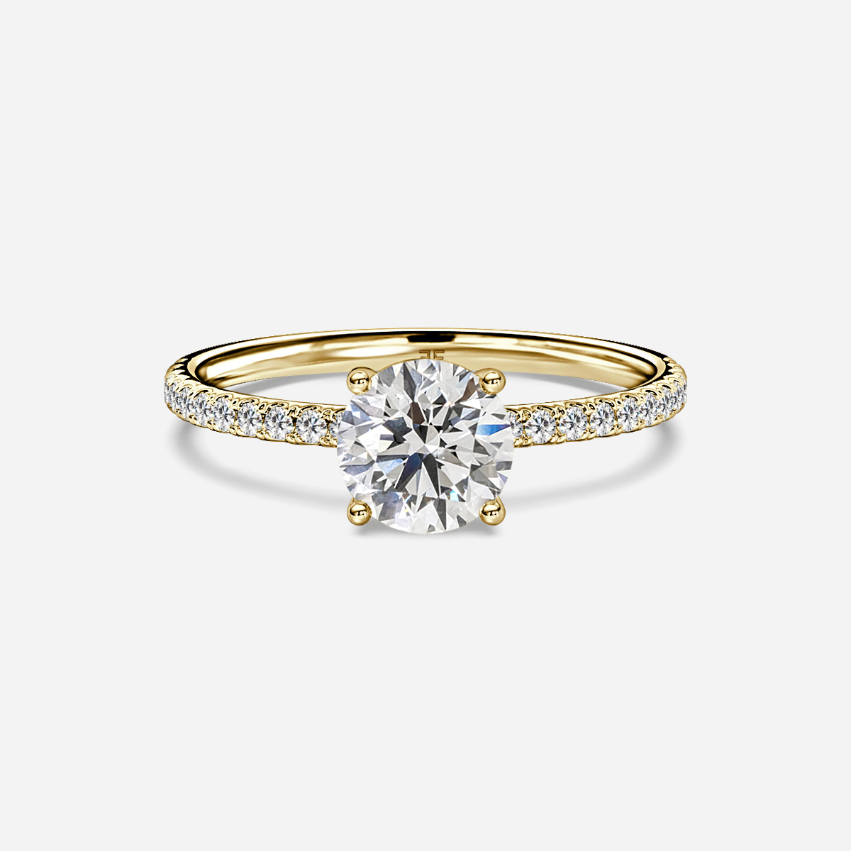 A yellow gold pave set diamond engagement ring featuring an elegant four prong setting, perfect for celebrating your special day in style. Handcrafted in Hatton Garden, London Centre Diamond Not Included Setting Only